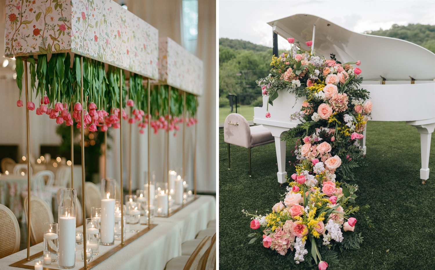 The result was a kaleidoscope of color and pattern, anchored by two stunning KYHA gowns that reflected her modern, fashion-forward style. Guests were welcomed into an atmosphere buzzing with personality—from the floral-draped cocktail bar and custom dance floor to the towering cake and even an espresso martini ice luge sculpted into an Alabama “A,” honoring their college roots.