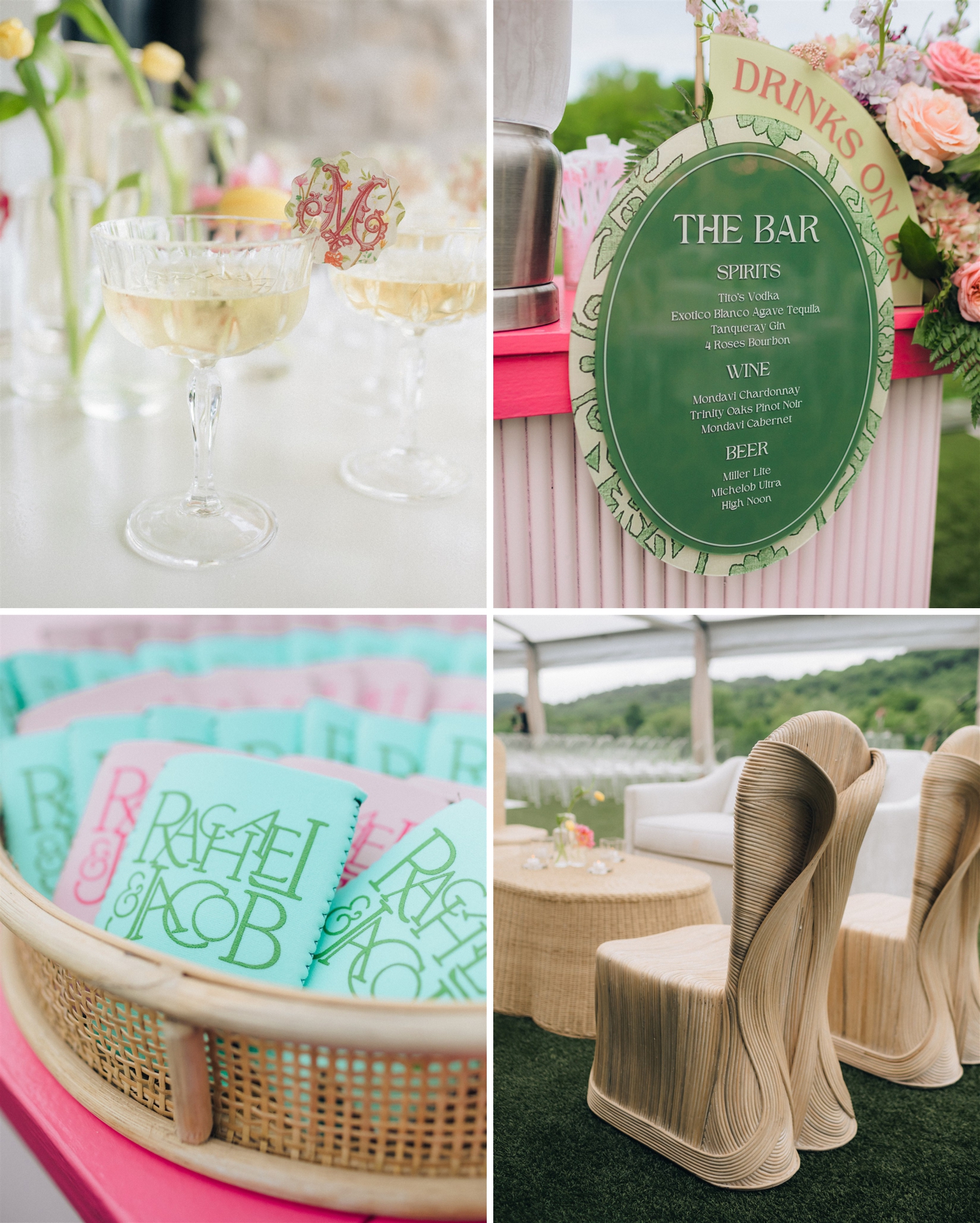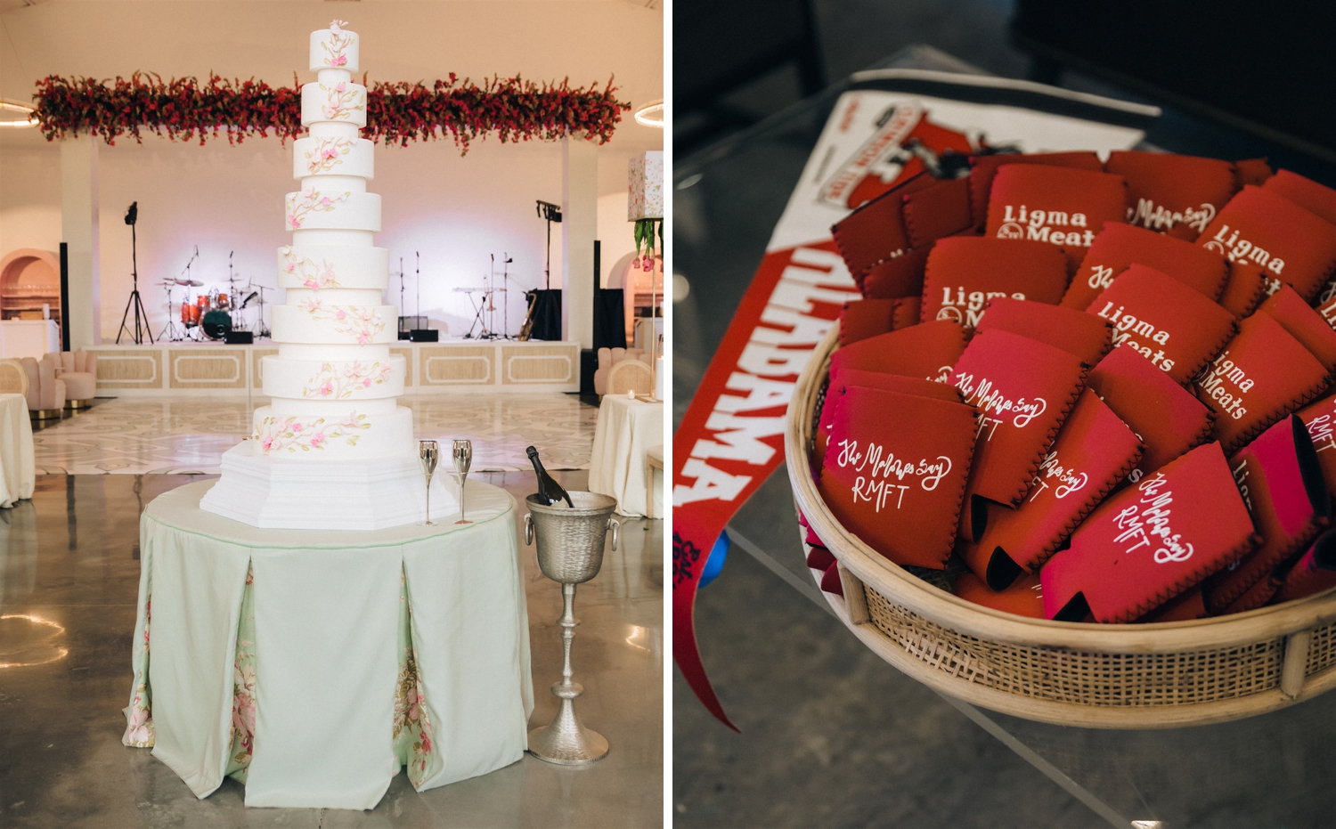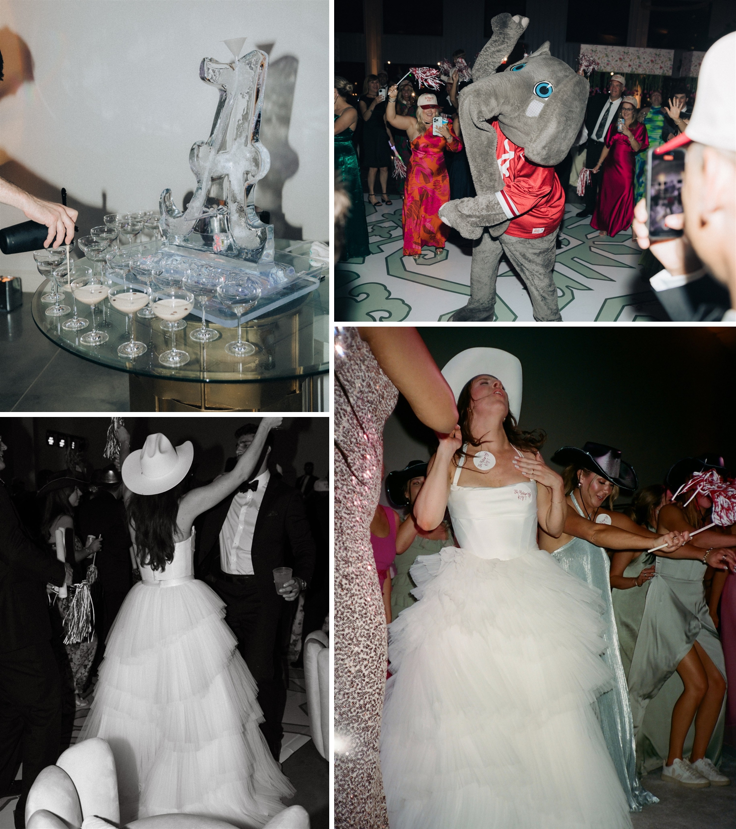 The result was a kaleidoscope of color and pattern, anchored by two stunning KYHA gowns that reflected her modern, fashion-forward style. Guests were welcomed into an atmosphere buzzing with personality—from the floral-draped cocktail bar and custom dance floor to the towering cake and even an espresso martini ice luge sculpted into an Alabama “A,” honoring their college roots.