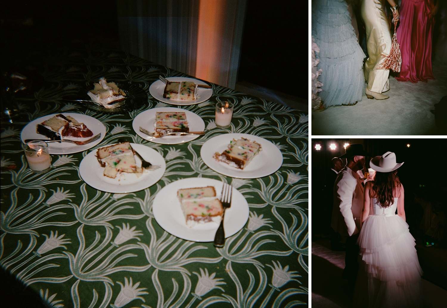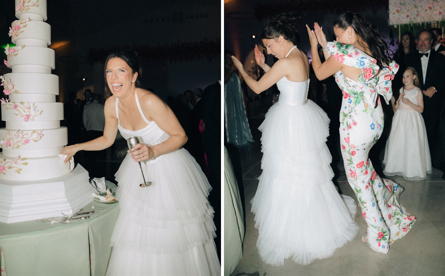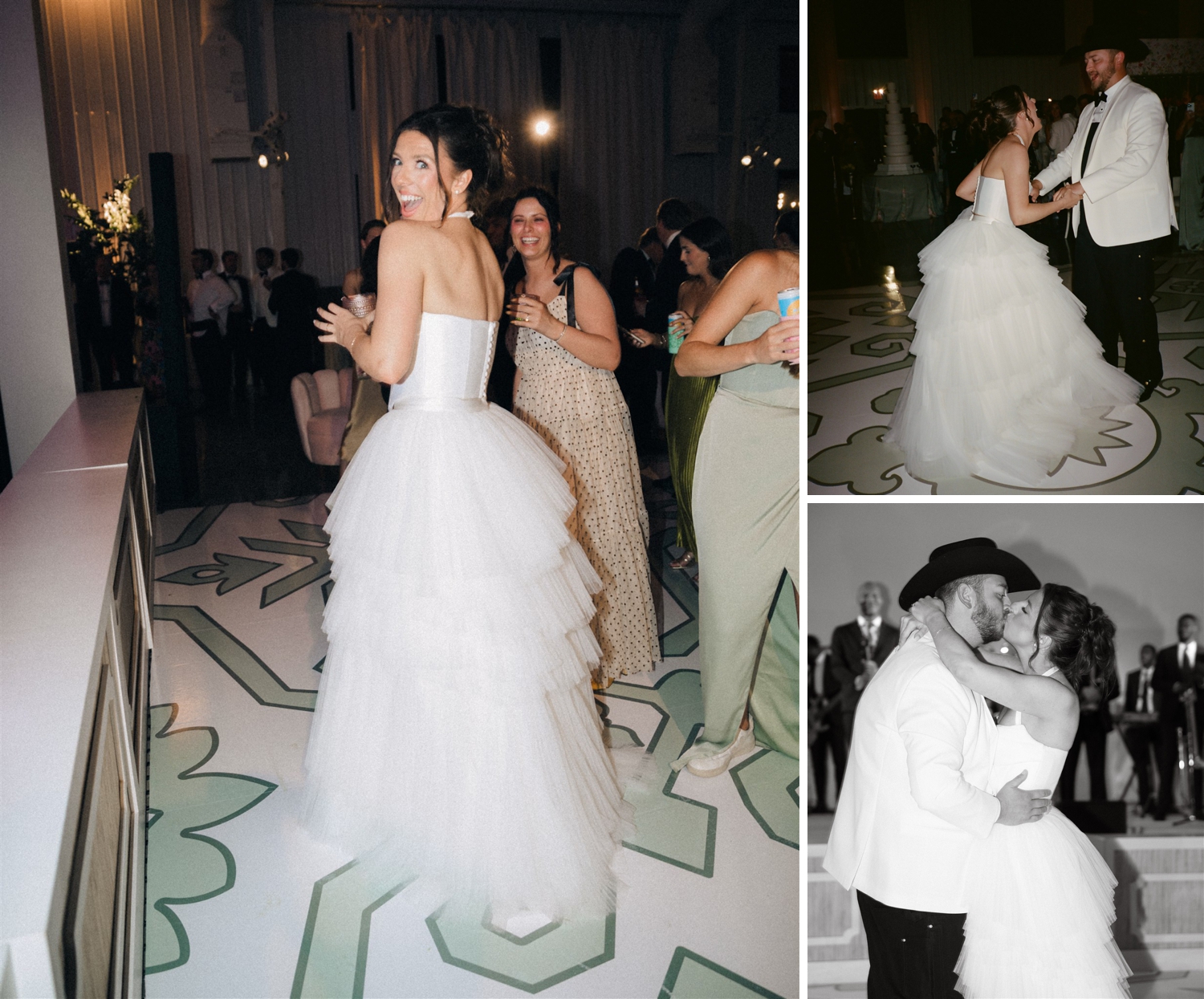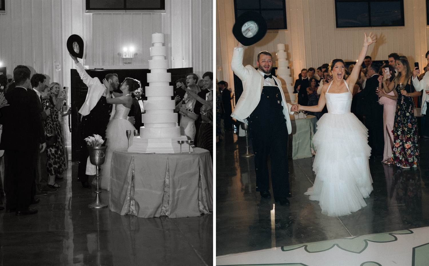 The result was a kaleidoscope of color and pattern, anchored by two stunning KYHA gowns that reflected her modern, fashion-forward style. Guests were welcomed into an atmosphere buzzing with personality—from the floral-draped cocktail bar and custom dance floor to the towering cake and even an espresso martini ice luge sculpted into an Alabama “A,” honoring their college roots.
