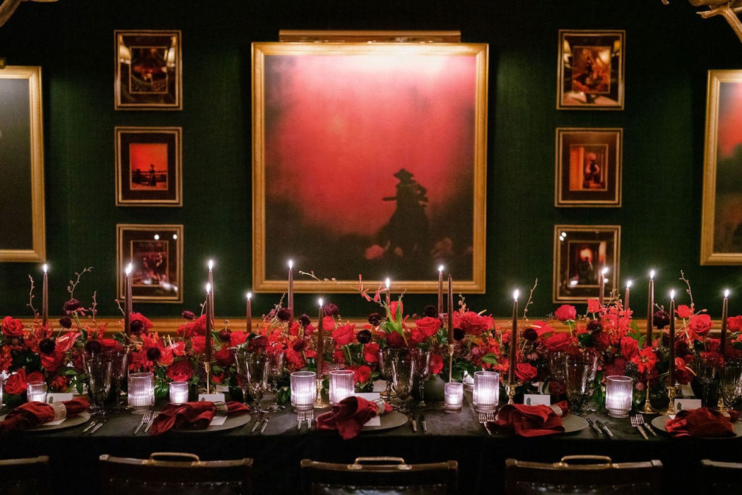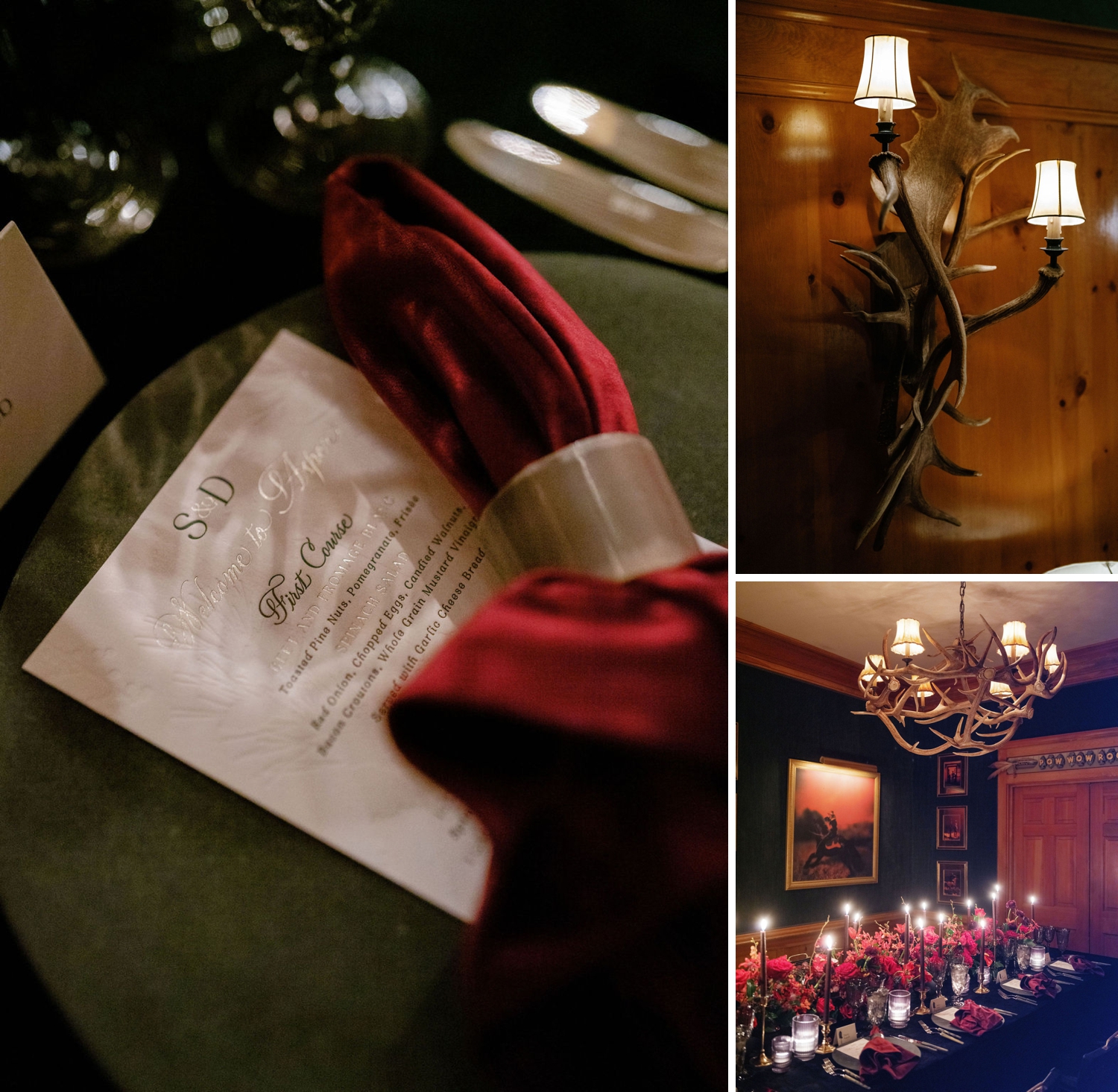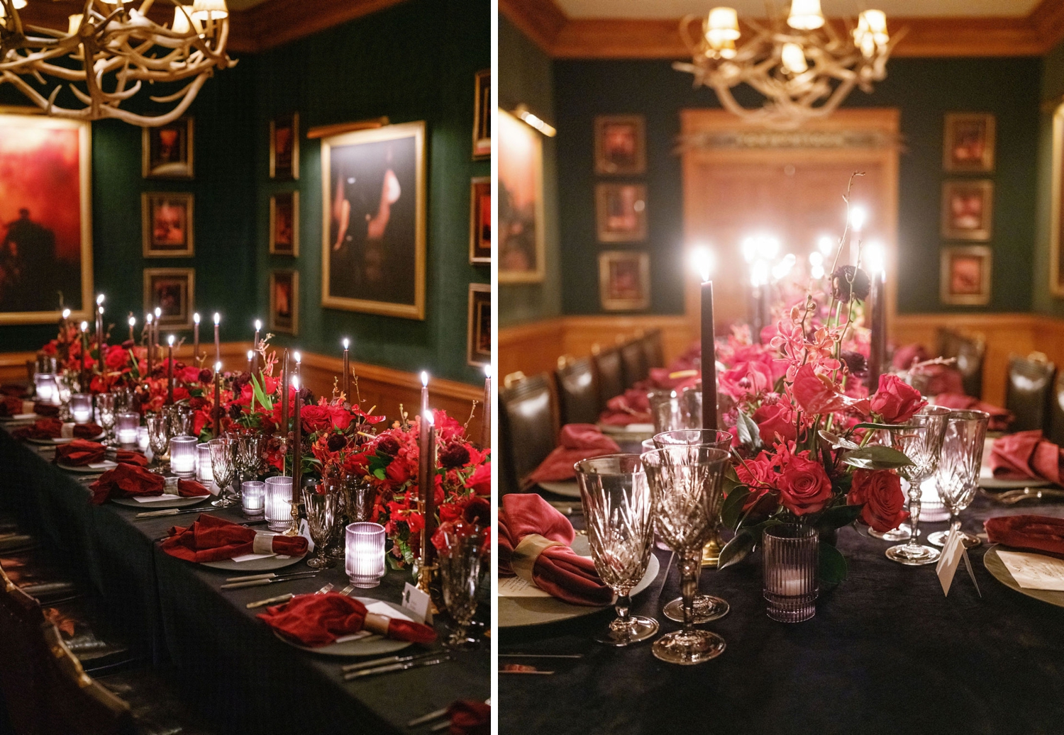 Designed with a palette of rich reds and warm neutrals, the setting was grounded in texture—velvet linens, romantic florals, and the soft glow of candlelight flickering across every surface. Antler chandeliers cast a golden warmth over the room, while slow pours of red wine and thoughtfully styled tablescapes encouraged guests to linger a little longer, to settle in, and to savor every moment.