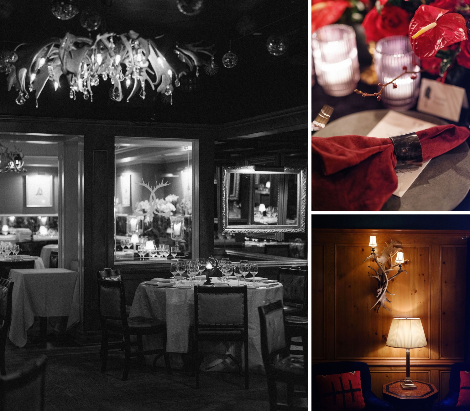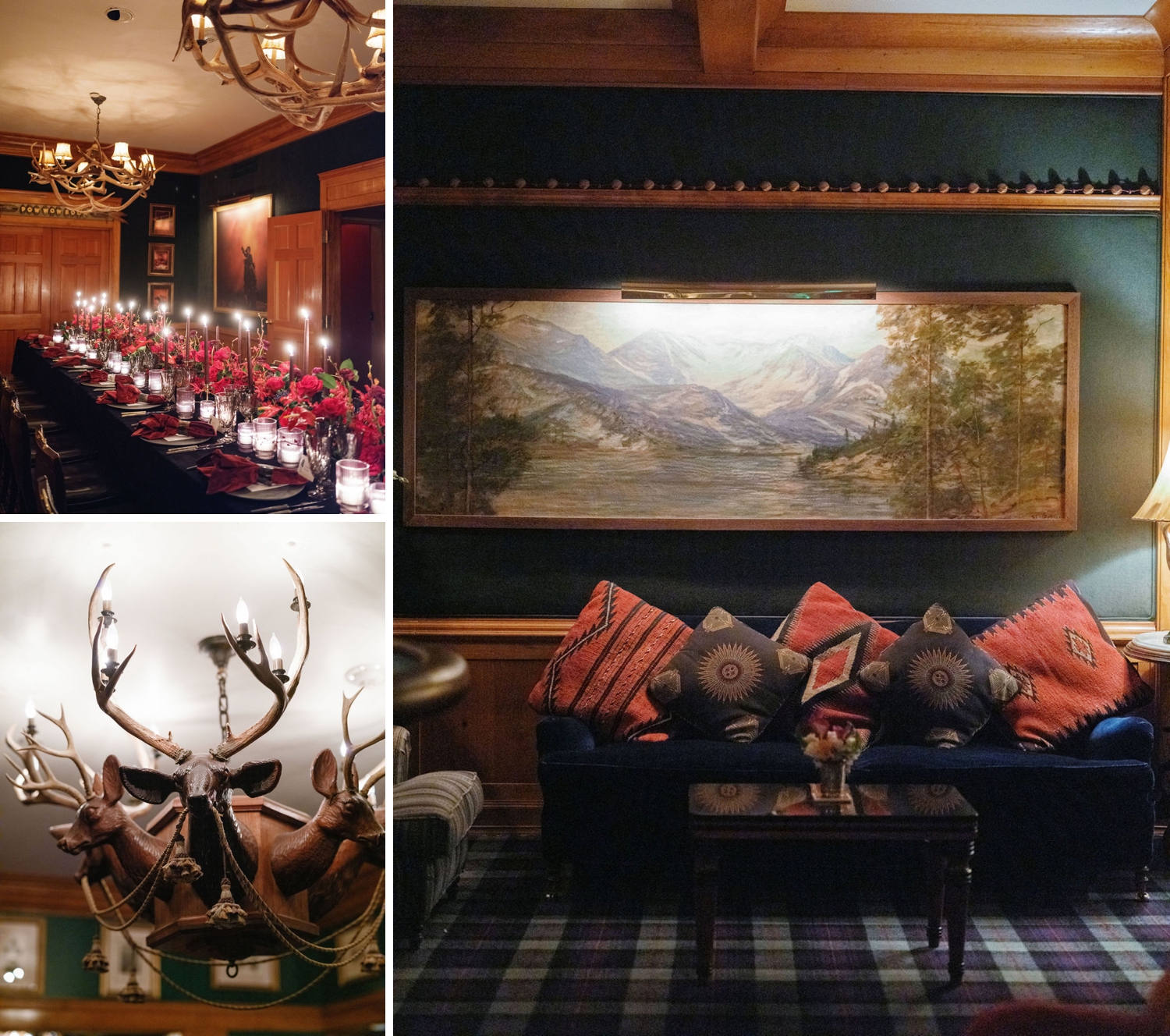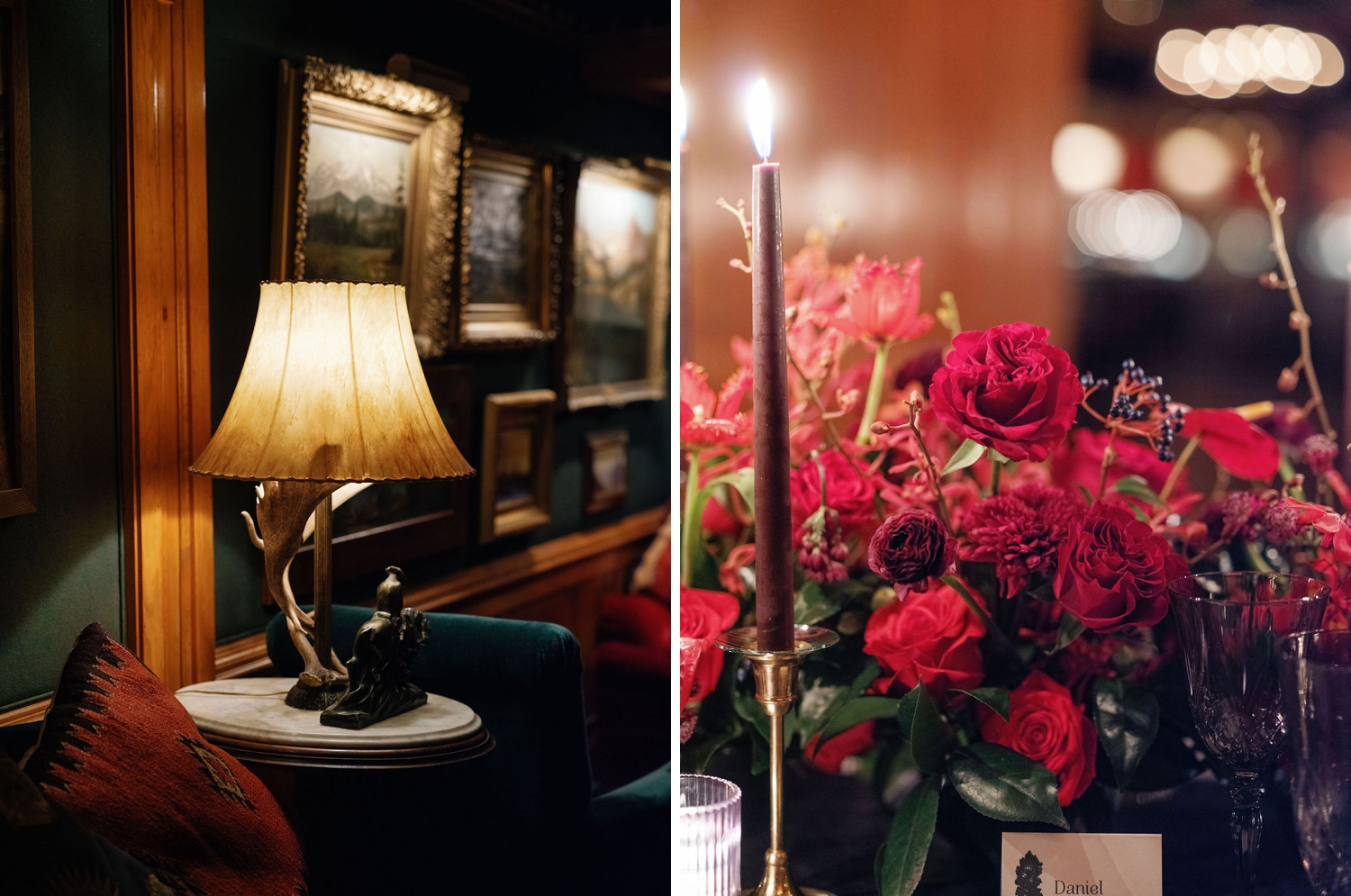 Designed with a palette of rich reds and warm neutrals, the setting was grounded in texture—velvet linens, romantic florals, and the soft glow of candlelight flickering across every surface. Antler chandeliers cast a golden warmth over the room, while slow pours of red wine and thoughtfully styled tablescapes encouraged guests to linger a little longer, to settle in, and to savor every moment.