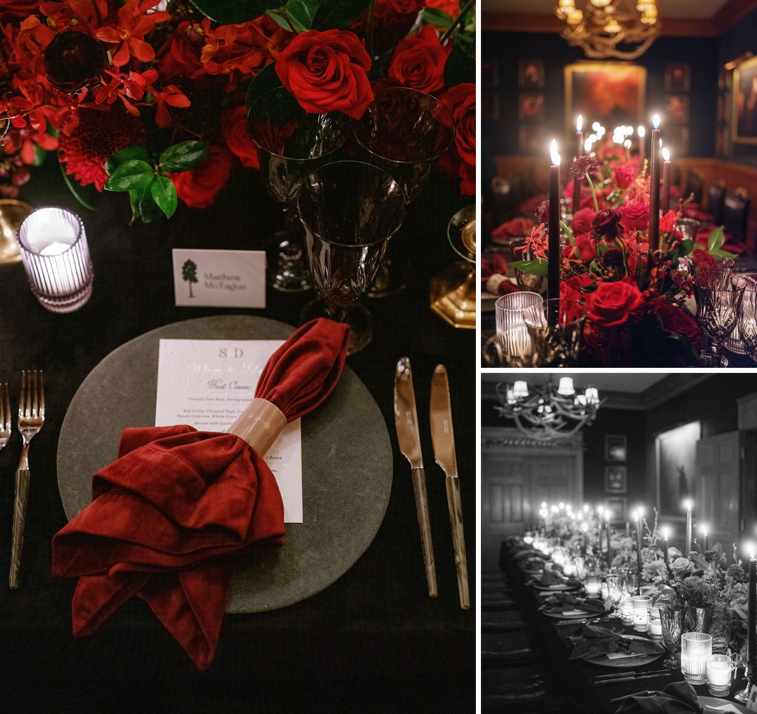 Layered florals in deep crimson tones by The Perfect Petal softened the space, while curated tabletop elements brought depth and dimension to each setting. The interplay of light and shadow created an almost cinematic quality—where every glance across the table felt like a moment suspended in time.