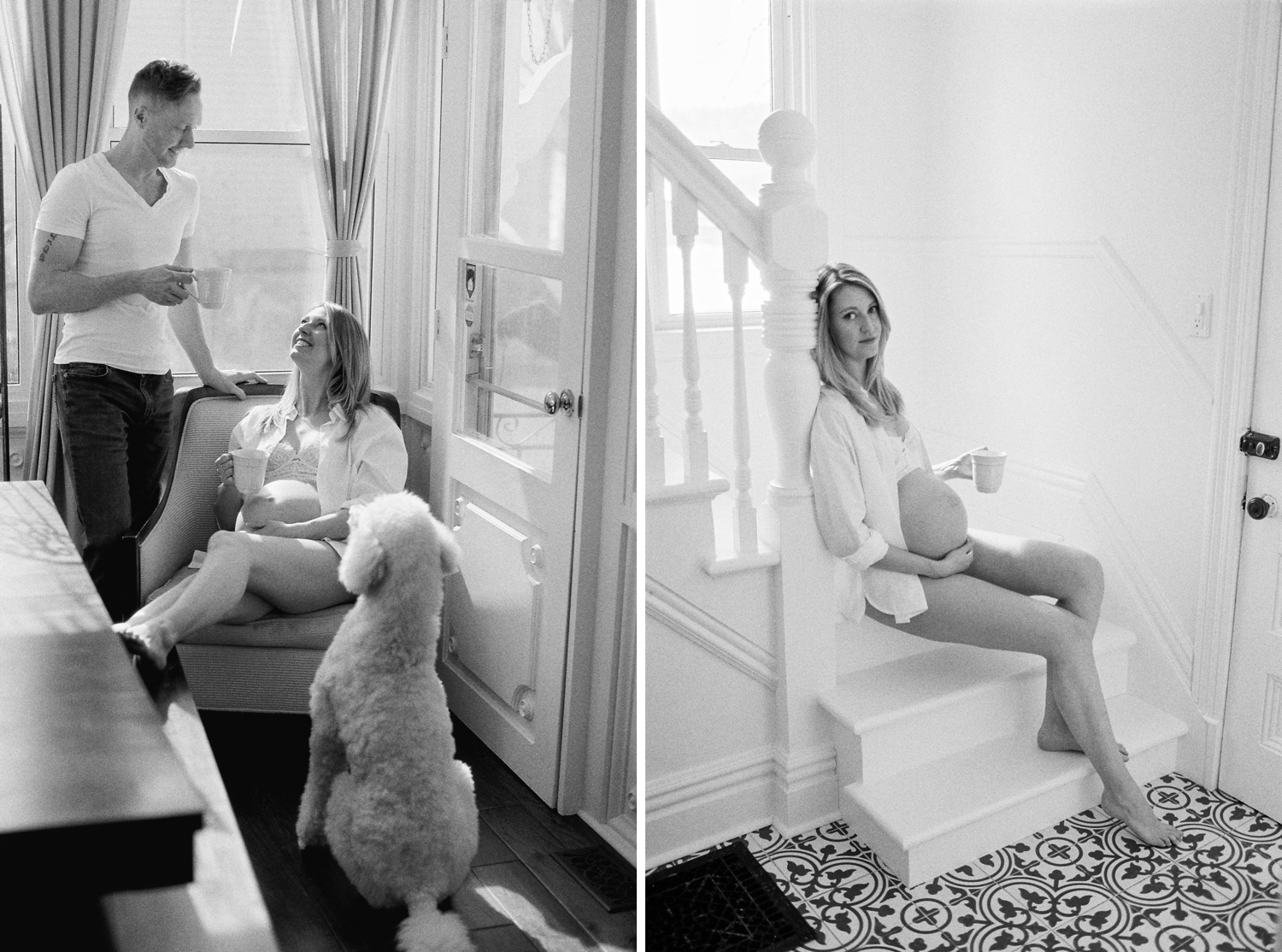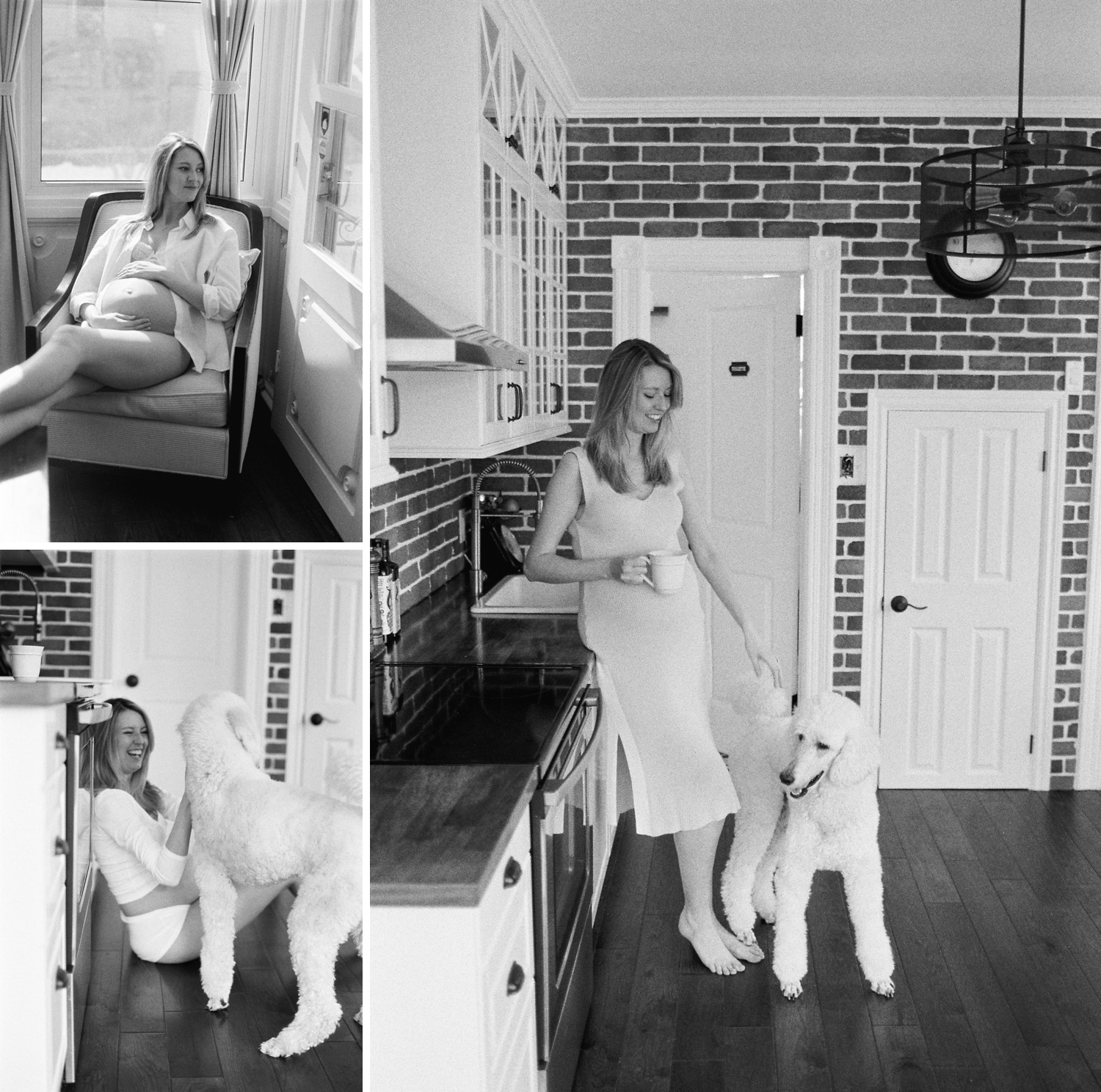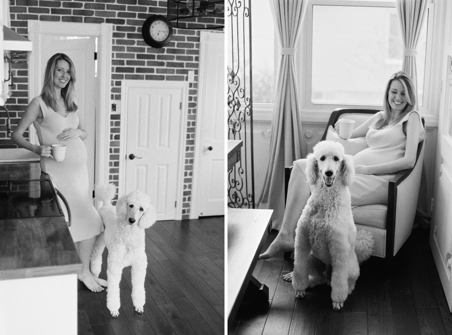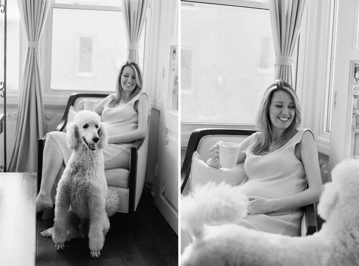 Photographed by their dear friend Madison McMahon, this at-home session was captured entirely on black and white film — a medium that perfectly matched the emotion of the day. Film’s timeless grain and nostalgic pull highlight the beauty of the in-between moments: morning coffee, soft light pouring through windows, and even the joy of including their pup, Winston.