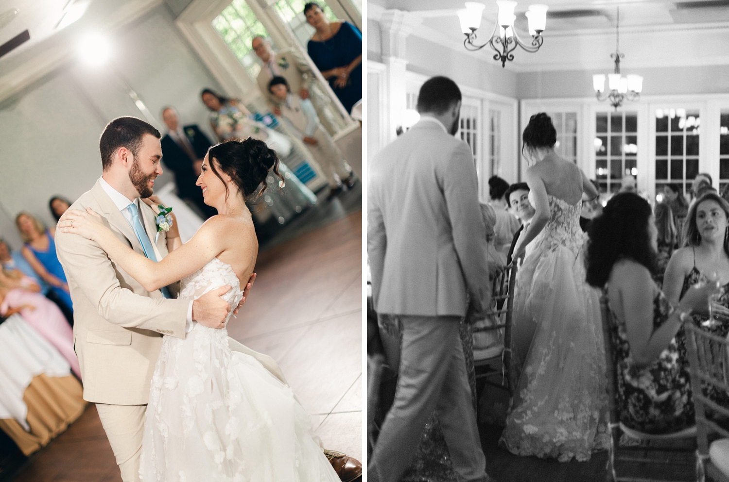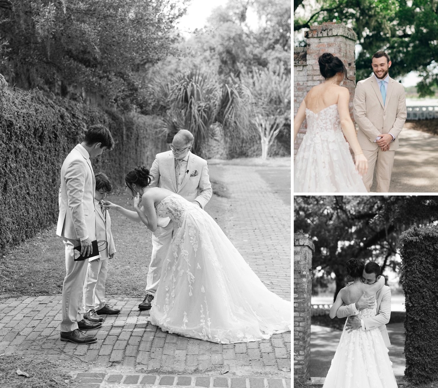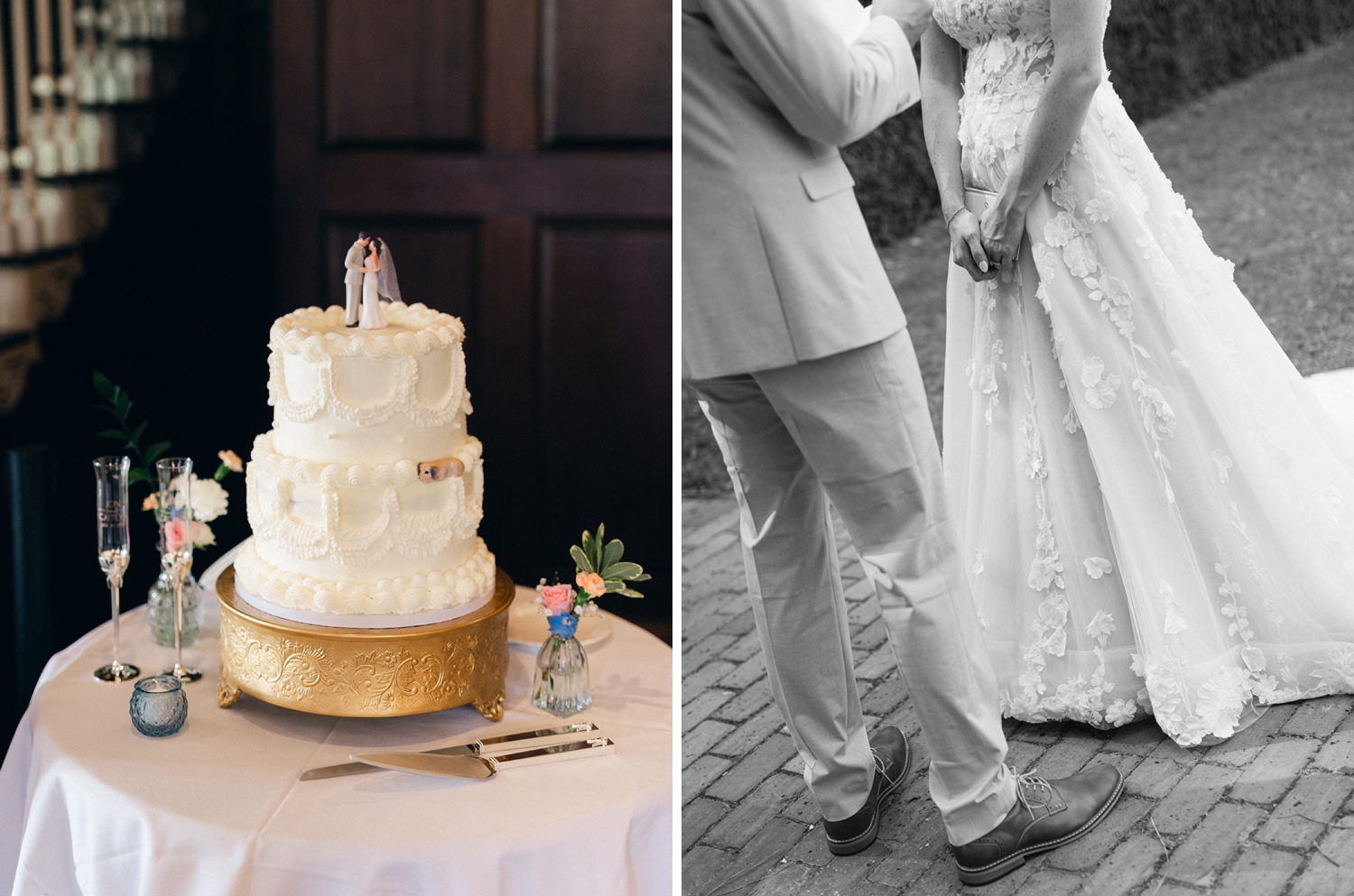 We tried really hard to honor the people who could not be with us at our wedding. The ring bearer pillow was made by my mom using pieces from my late grandmother’s wedding dress. We ate and drank off of a china set, that my late grandmother had passed down to me, for our first meal as a married couple. My mom also found and ordered us a custom statue of our dog, Nala, that was incorporated into our cake. My grandfather custom built a card box for us of Rainbow Row, one of the iconic spots in Charleston. My grandmother also hand painted our cake topper because we could not find any for sale with the groom in a beige suit to match Jon’s wedding suit. We think a marriage is more than just two people joining, but rather two whole families and it was really special to see everyone involved in giving us the perfect day!