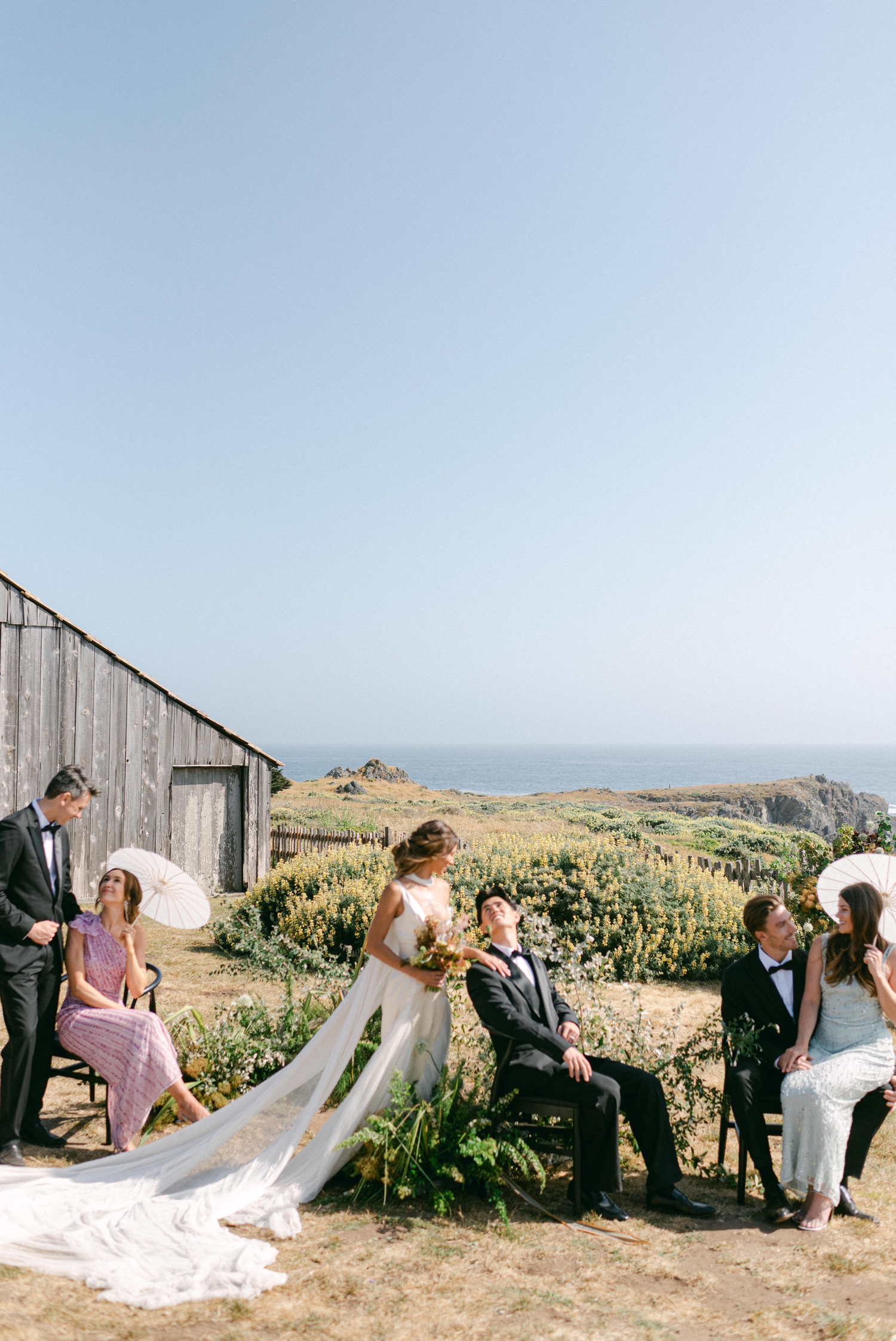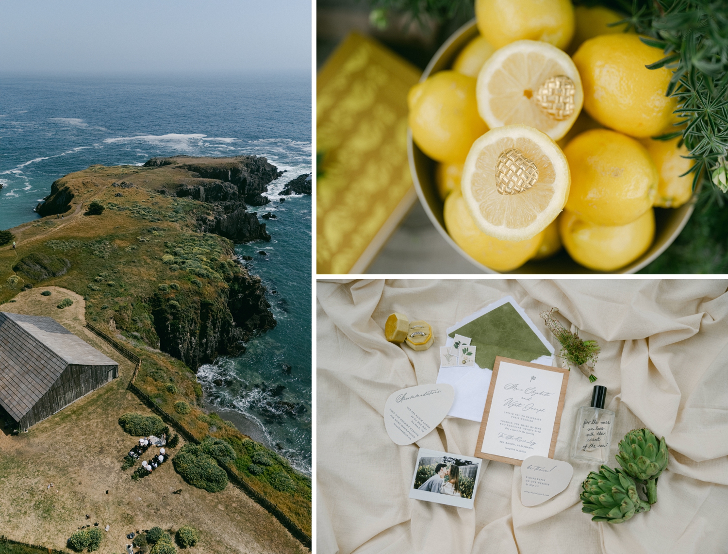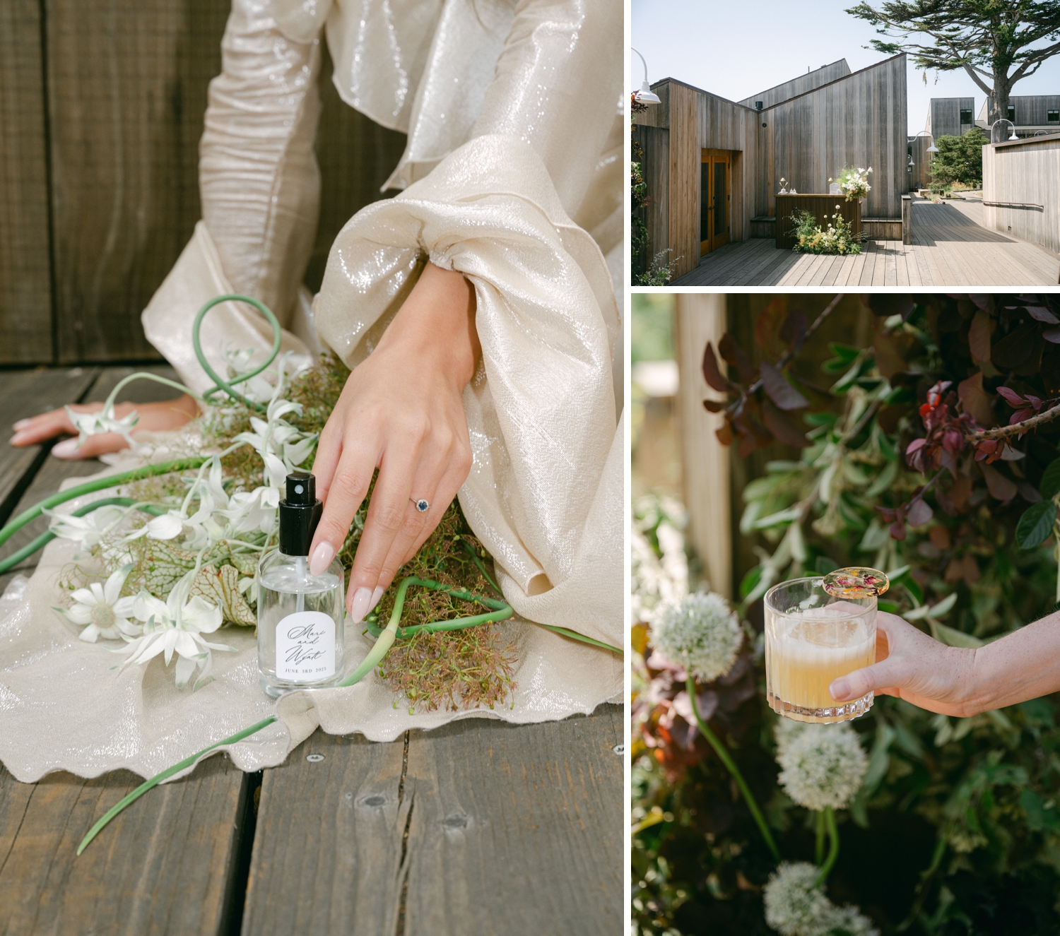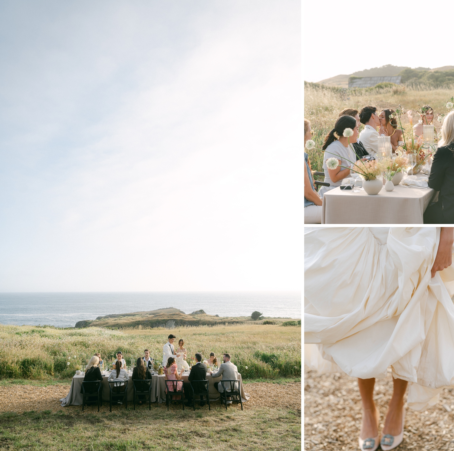 As golden hour gave way to dusk, the evening gathered around a candlelit table layered with mismatched linens, bowls of figs and stone fruit, and soft laughter under the first stars. Every detail — from a custom botanical wedding perfume to Super 8 footage woven into the gallery — reflected a love rooted in memory, wanderlust, and quiet romance. Subtle, soulful, and entirely their own, this Sea Ranch celebration was less a wedding and more a feeling — one meant to be carried long after the tide receded.