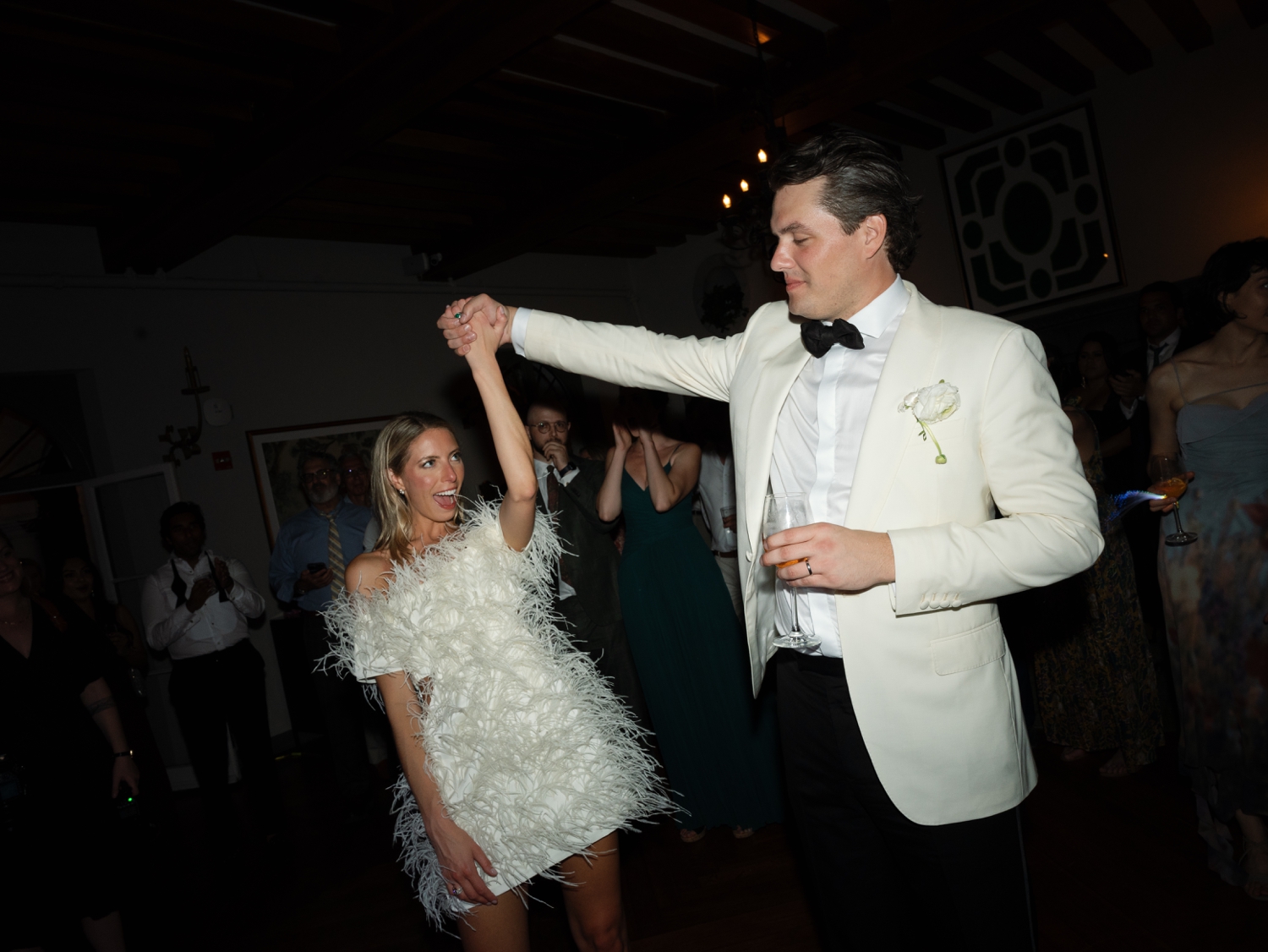 The reception that followed was a true reflection of the couple’s modern-meets-classic style. Guests gathered under the courtyard arches for dinner, drinks, and dancing, surrounded by candlelight and delicate green-and-white details. Scalloped plates, tassel-adorned menus, and lush white blooms infused vintage charm into the design, while modern textures and sleek styling elevated the look for today’s bride.