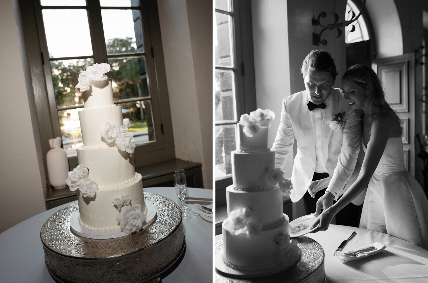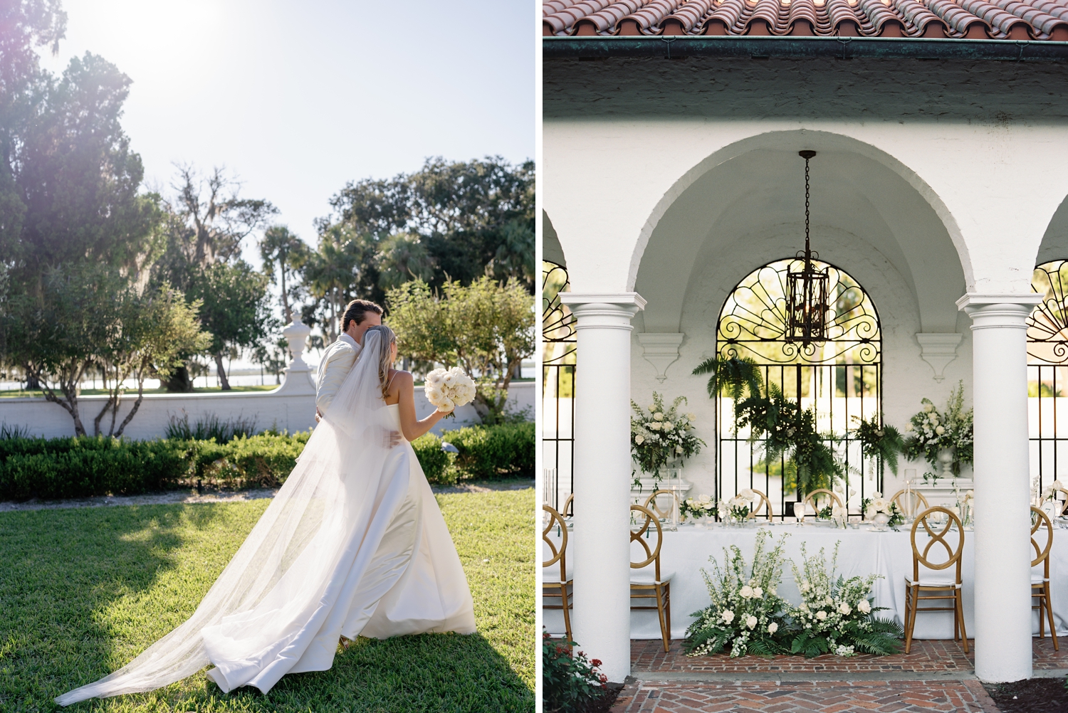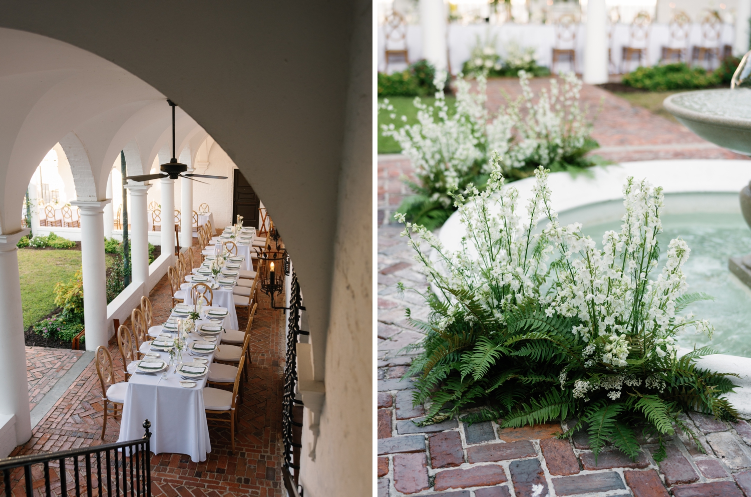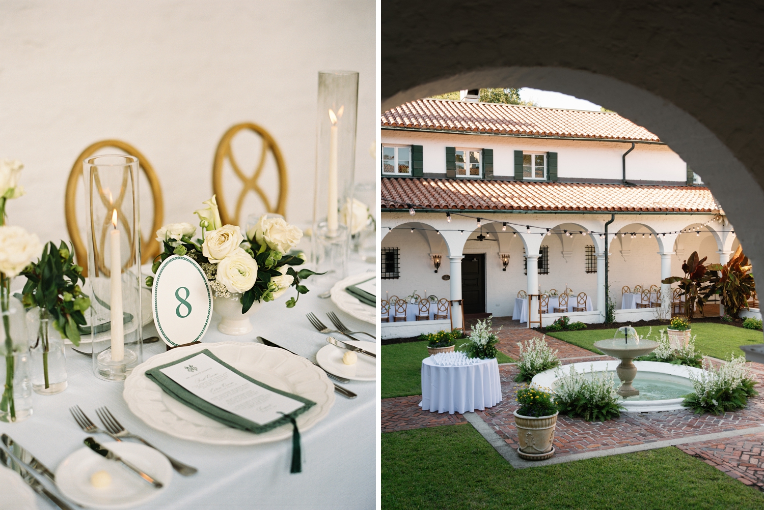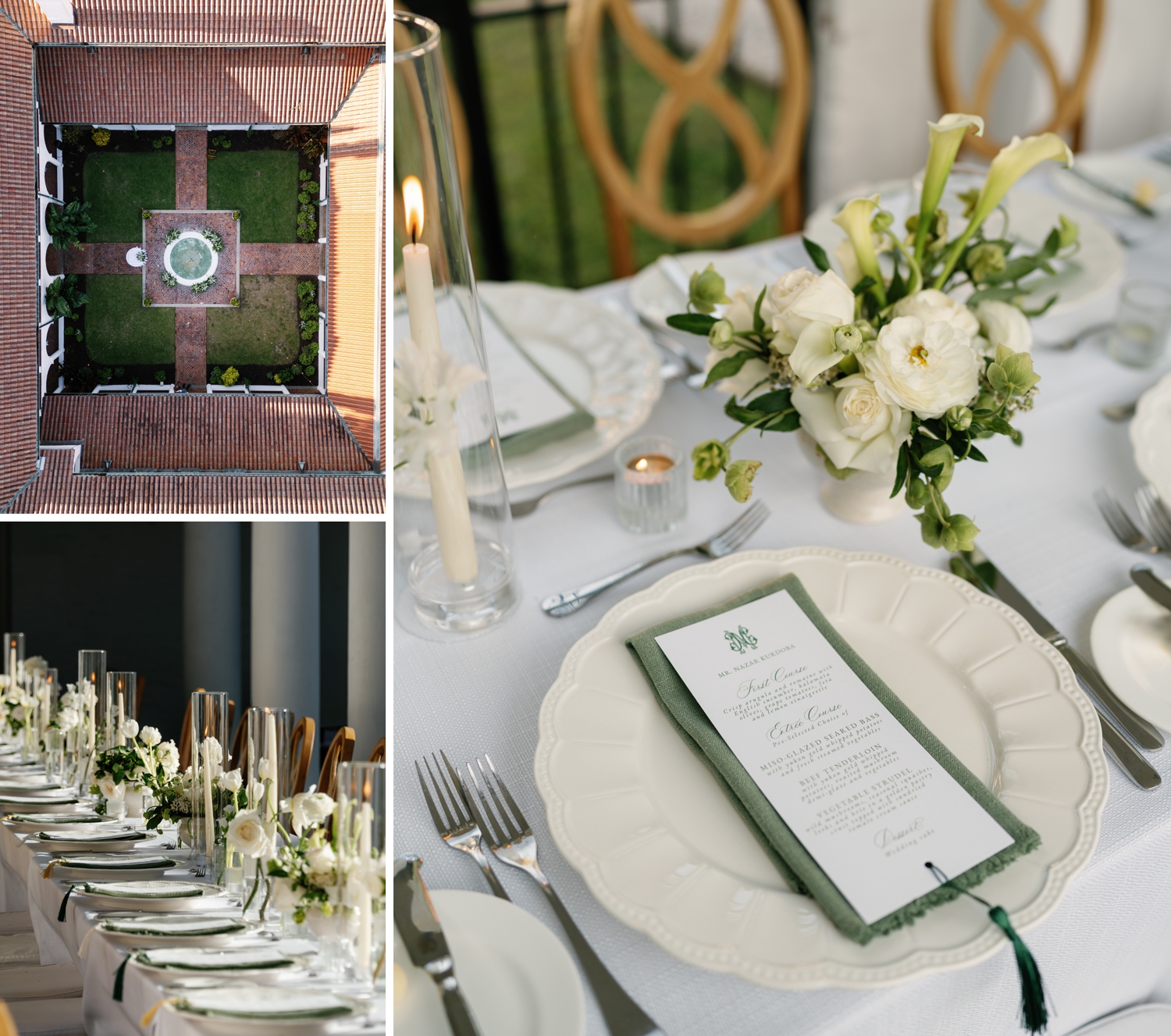 The reception that followed was a true reflection of the couple’s modern-meets-classic style. Guests gathered under the courtyard arches for dinner, drinks, and dancing, surrounded by candlelight and delicate green-and-white details. Scalloped plates, tassel-adorned menus, and lush white blooms infused vintage charm into the design, while modern textures and sleek styling elevated the look for today’s bride.