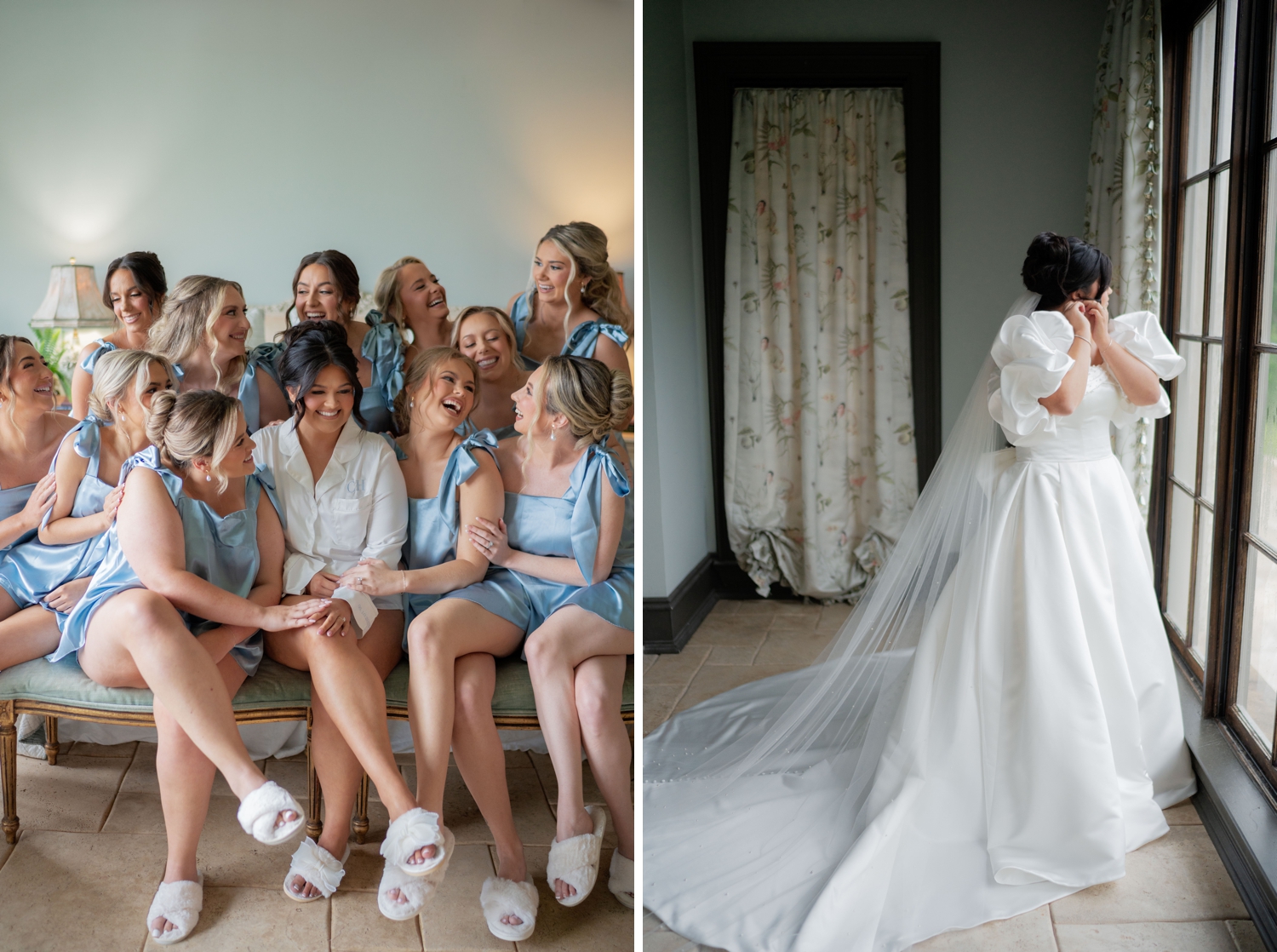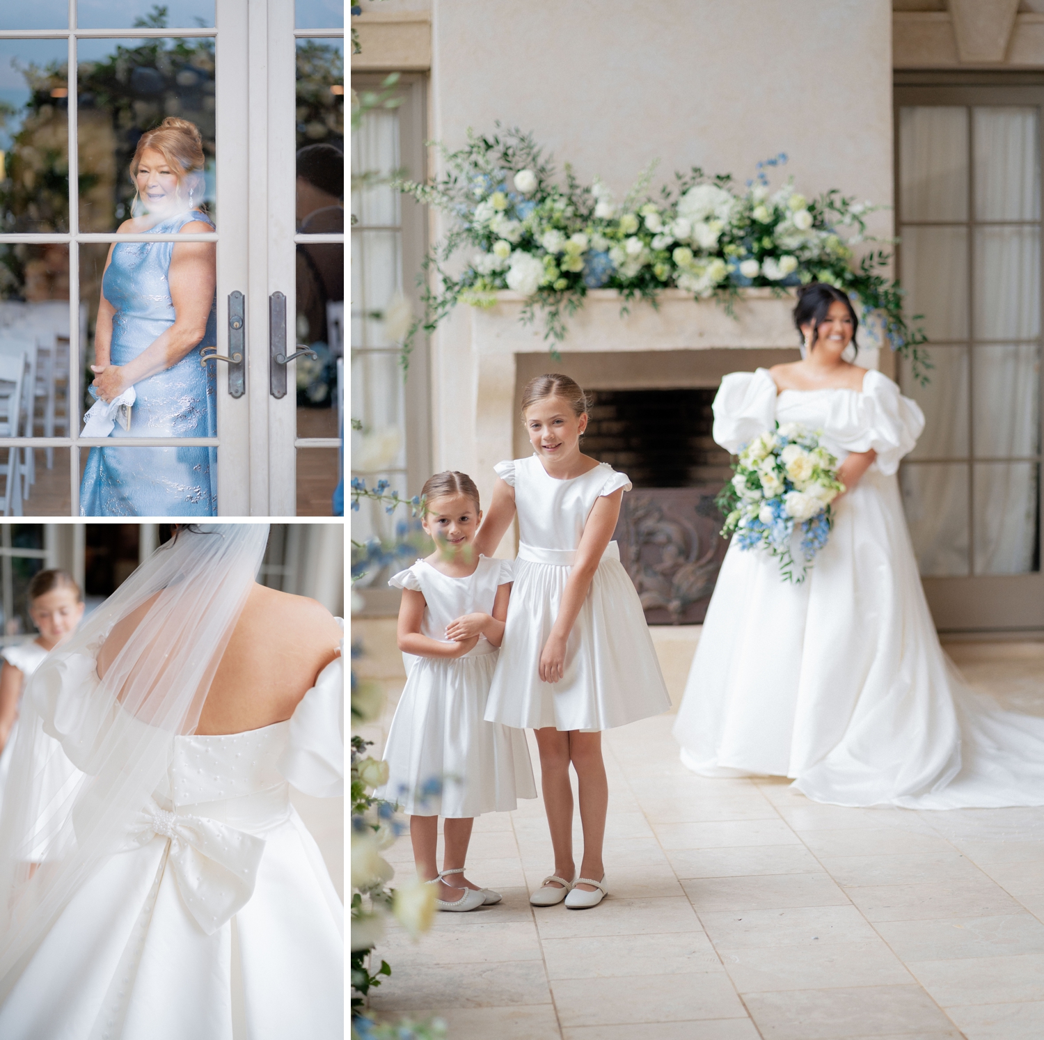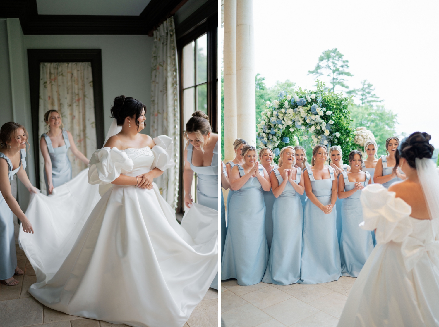 The bride wore a timeless gown from Something Blue Shoppe, paired with a cathedral-length veil that caught the light in all the right ways—especially during a quiet veil shot Cassidy had dreamed of. Her hair and makeup, by Asia Nicole, carried a fresh, effortless glow. In keeping with the soft, organic aesthetic of the day, bridesmaids wore muted neutrals from Dessy Group via Bella Bridesmaids, and the florals by Southern Posies struck a balance between refined and wild, with soft greens and airy blooms echoing the landscape.