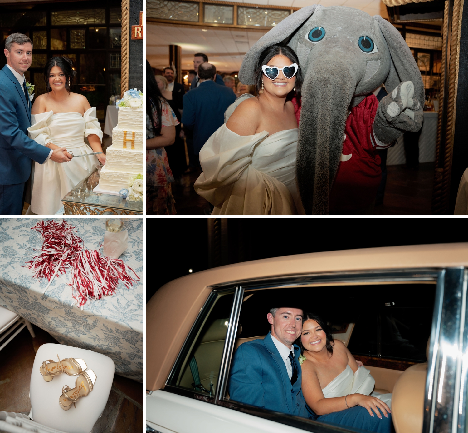 After emotional first dances—including a father-daughter dance to “There Goes My Life” and a joyful mother-son moment set to “How Sweet It Is to Be Loved by You”—the energy picked up when a surprise guest arrived: Big Al, the University of Alabama’s beloved mascot. Cassidy and her bridesmaids, all but one of whom are Alabama alumni, gathered for photos and a few spirited cheers.