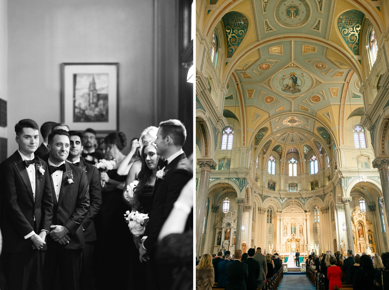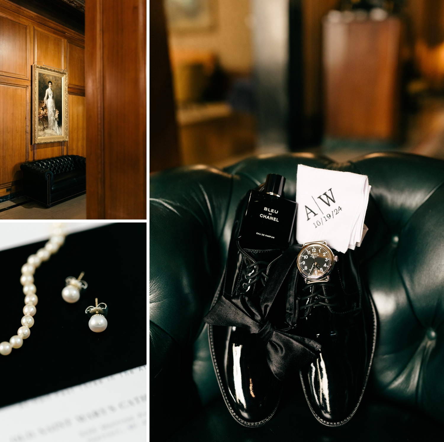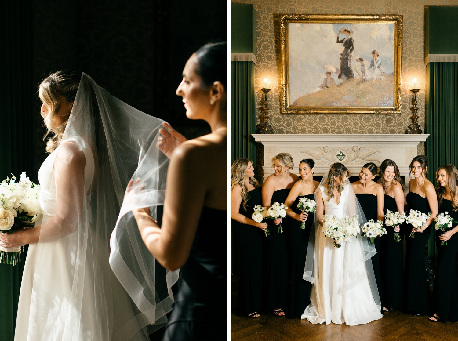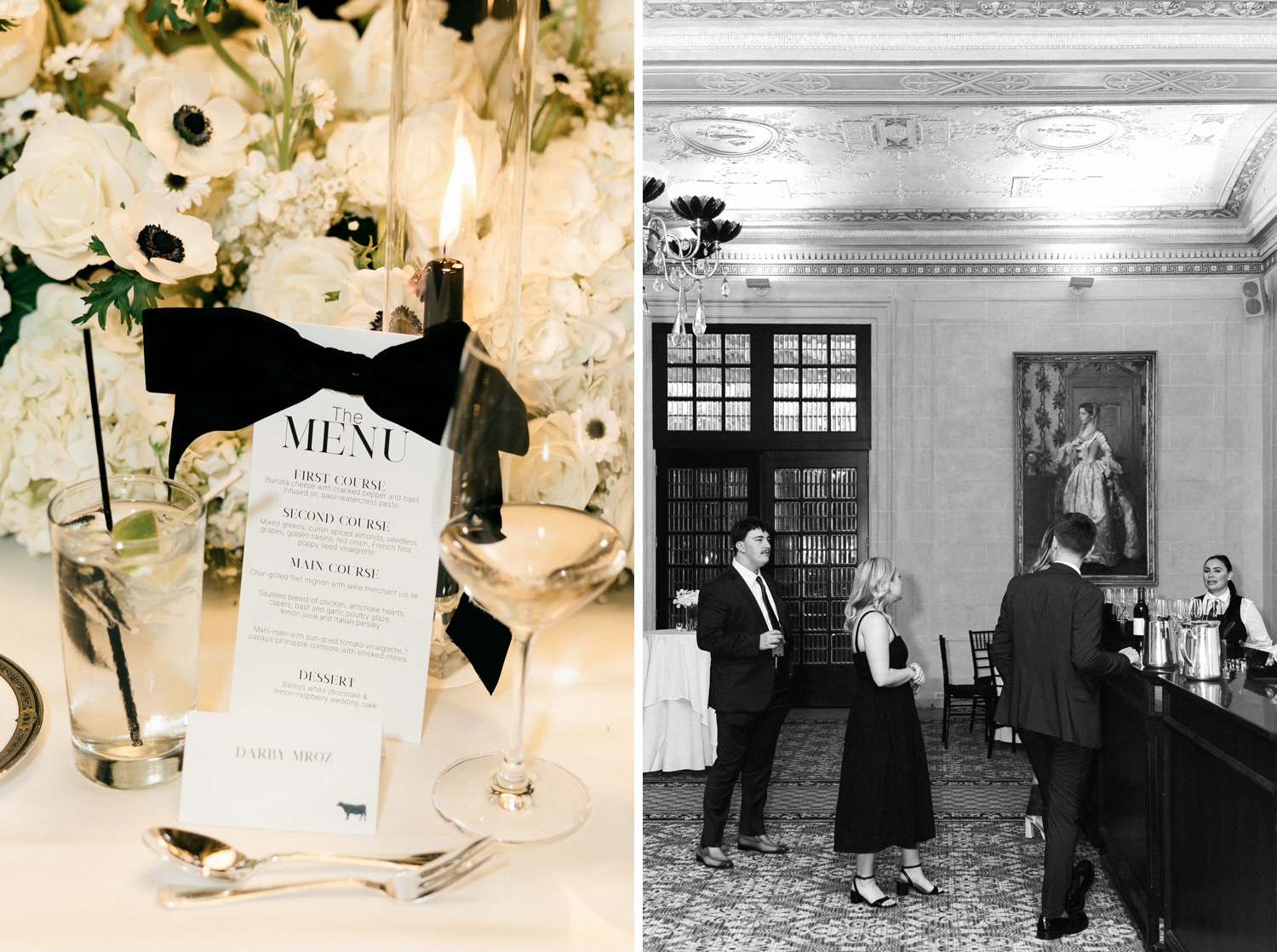 The day unfolded with a quiet sophistication, every detail layered with intention and heritage. Morning light spilled across the DAC’s marble interiors as Angela prepared with her bridesmaids, laughter echoing through the historic halls. Her gown, a timeless design by Sarah Seven, embodied both structure and softness—complemented by a delicate pelerine she later added for the ceremony at Old Saint Mary’s Catholic Church, a nod to reverence and grace.