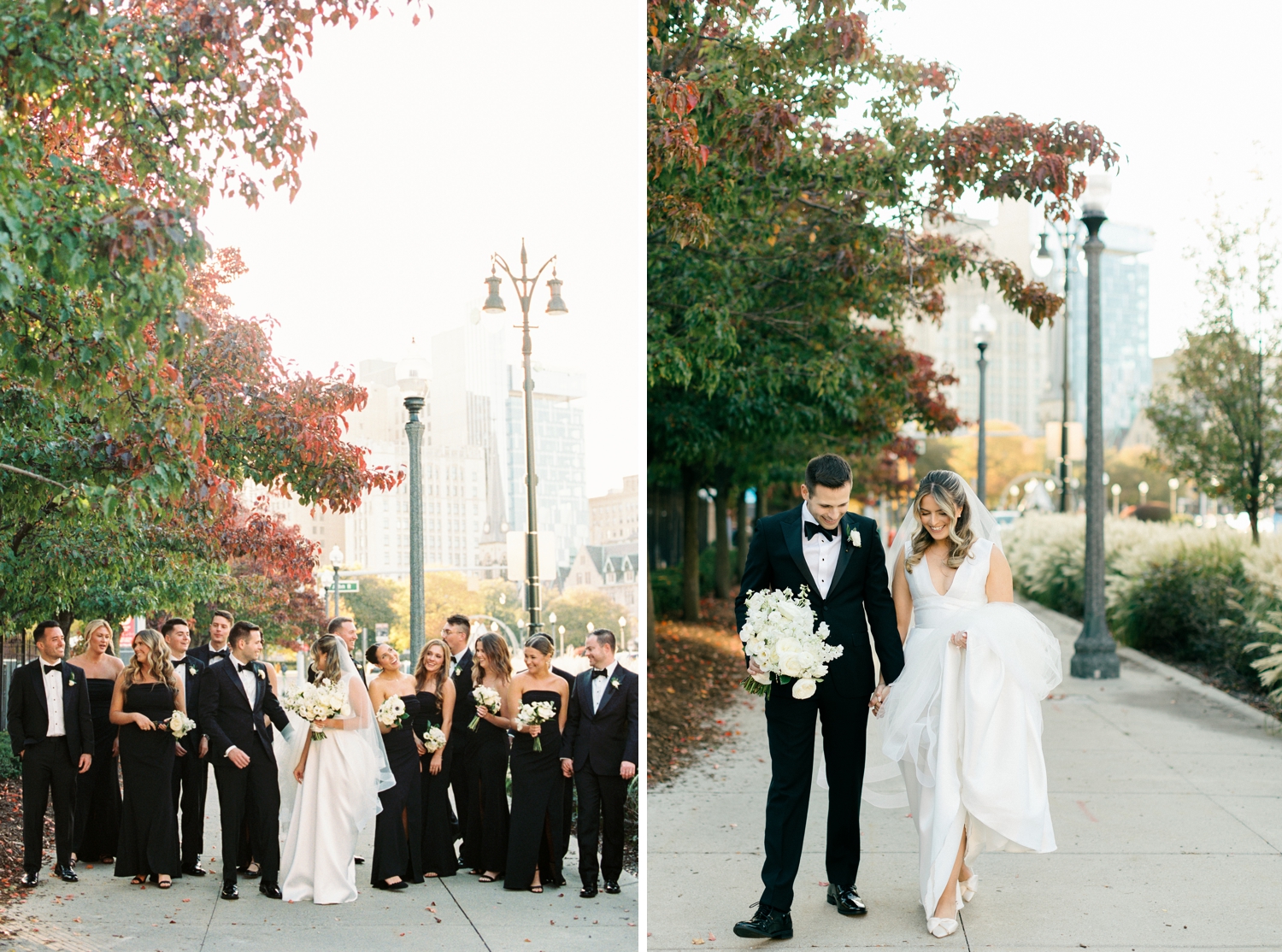As daylight faded, the couple and their photographer captured portraits that bridged Detroit’s modern architecture with the refined interiors of the DAC. The golden tones of autumn mirrored the warmth of their celebration—a palette of ivory, champagne, and deep wood textures curated by Fear No More Events. Guests were greeted in the Reading Room for cocktail hour, where the DAC’s character shone beneath candlelight and classical details.