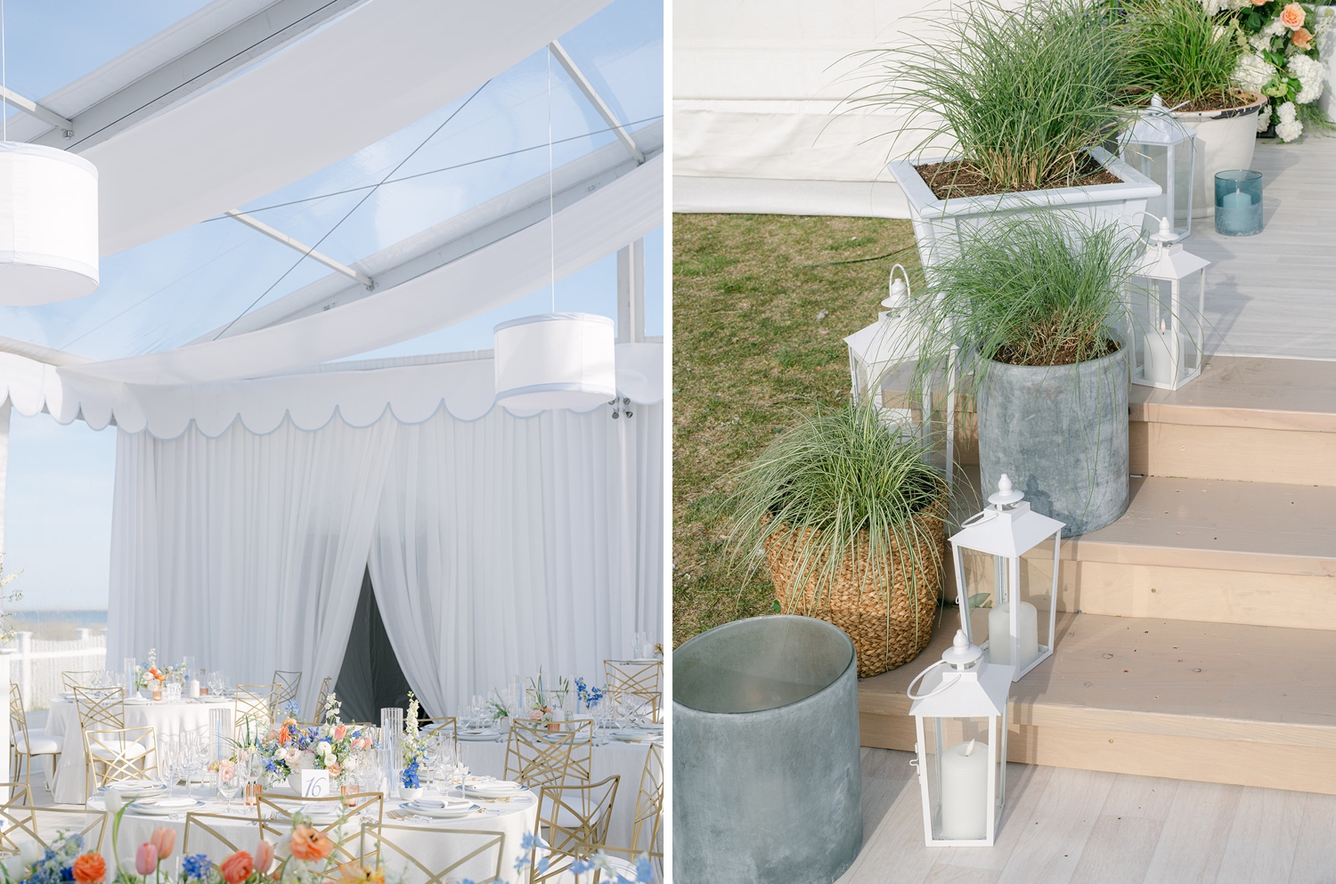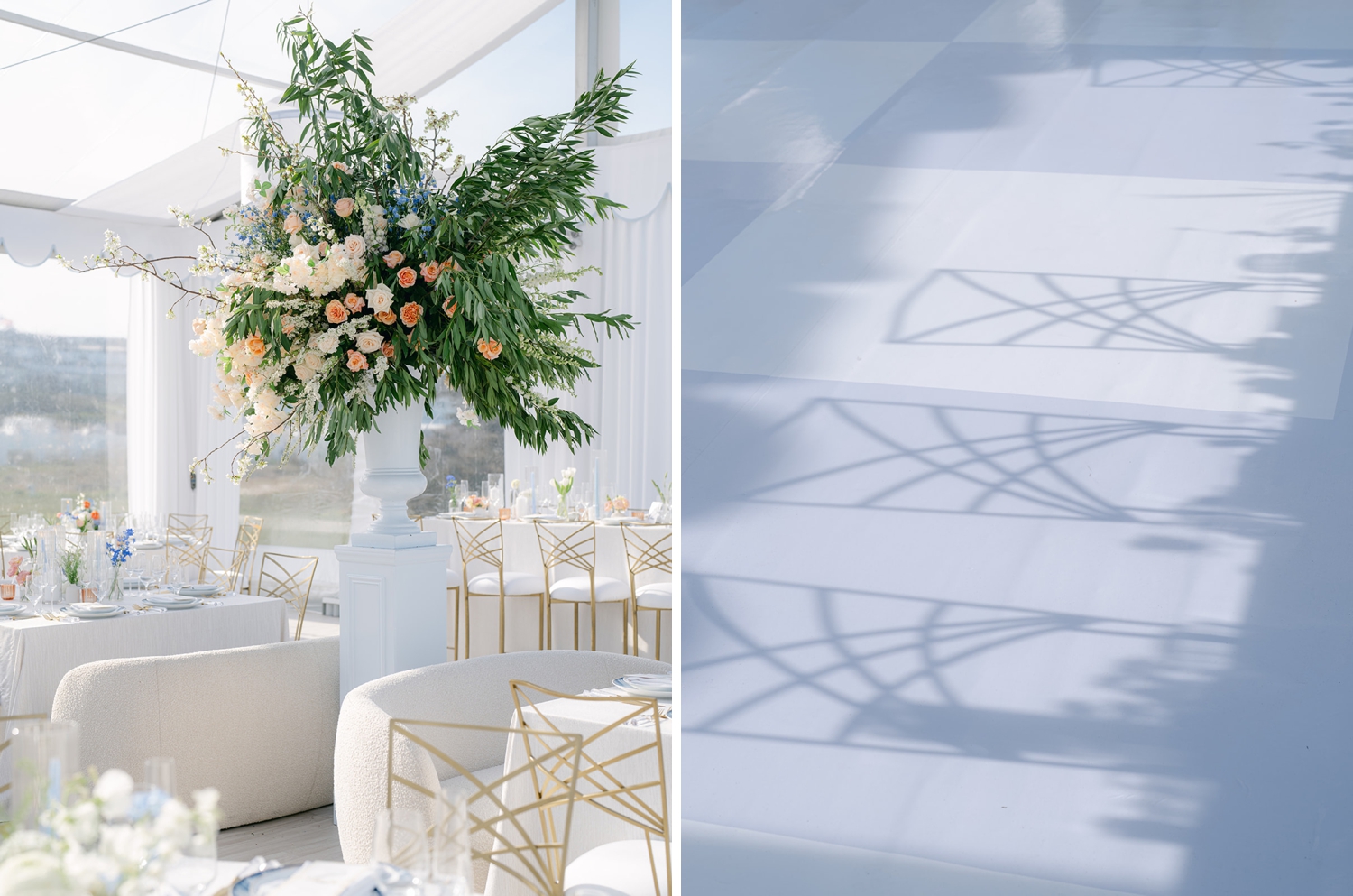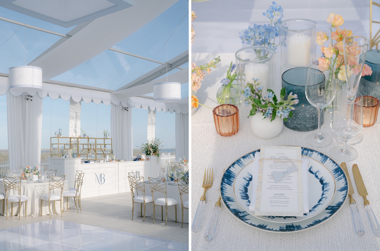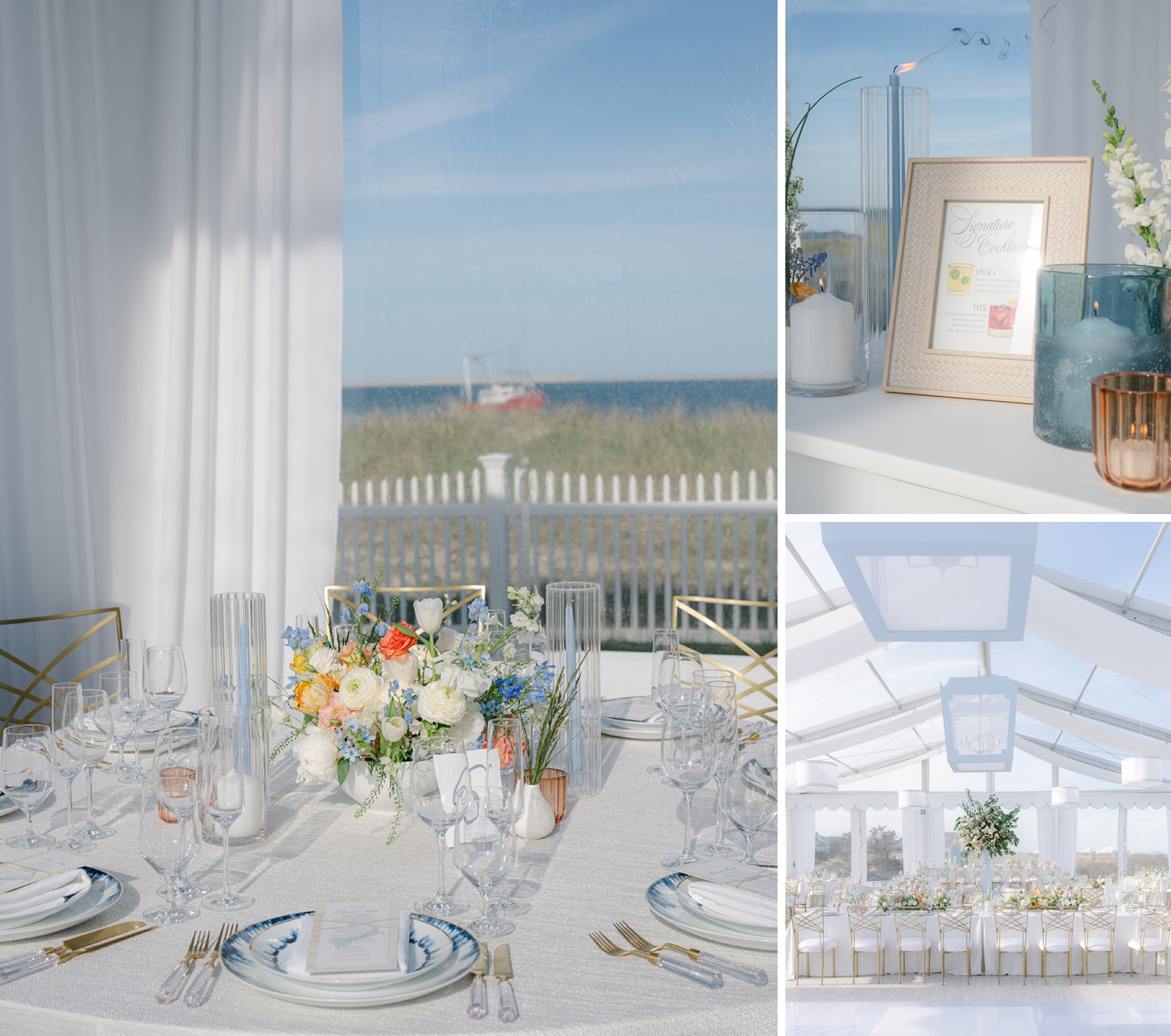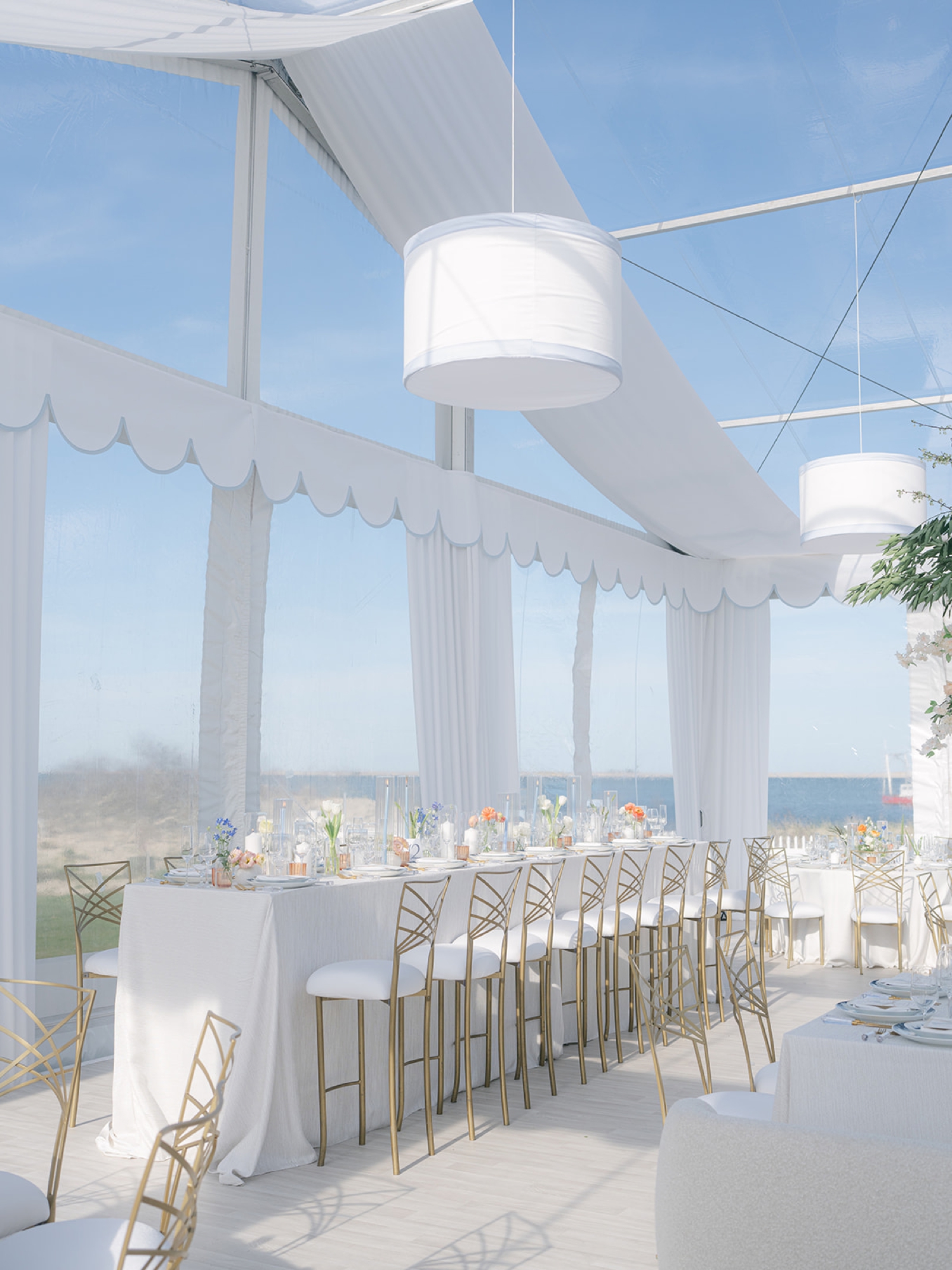 Following a heartfelt church ceremony downtown, guests gathered beneath a clear-top tent overlooking the ocean. Every detail, from the sculptural florals by Beach Plum Floral to the monogrammed bar and sweeping sailcloth accents, was thoughtfully designed to complement the coastal surroundings while maintaining a sense of elevated sophistication.