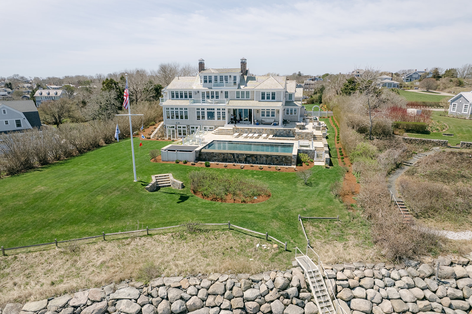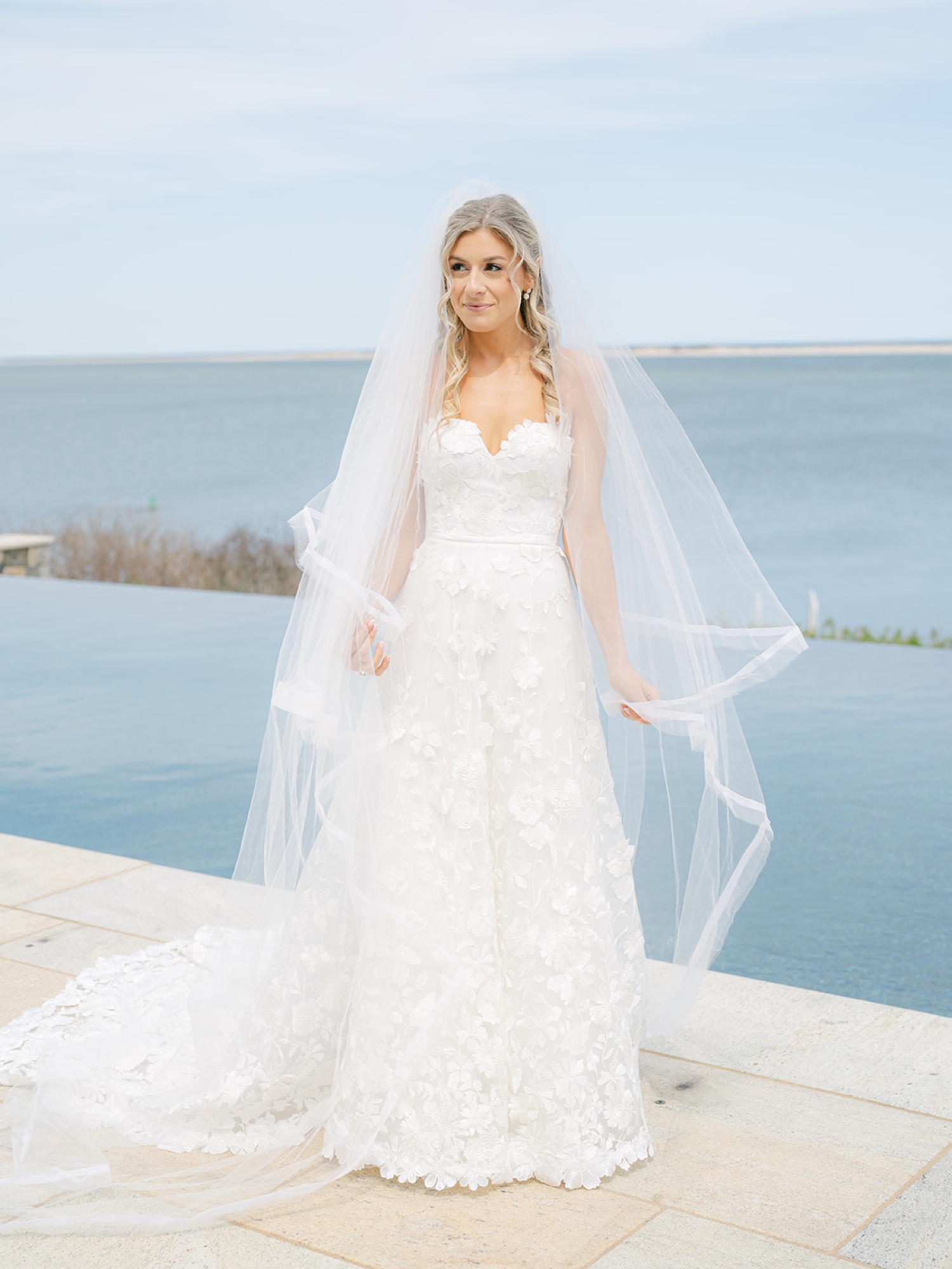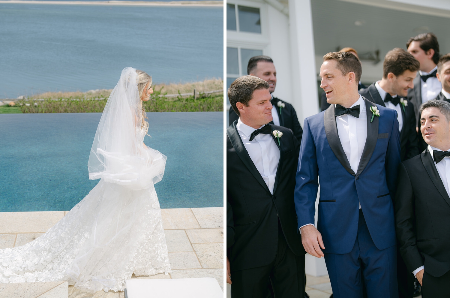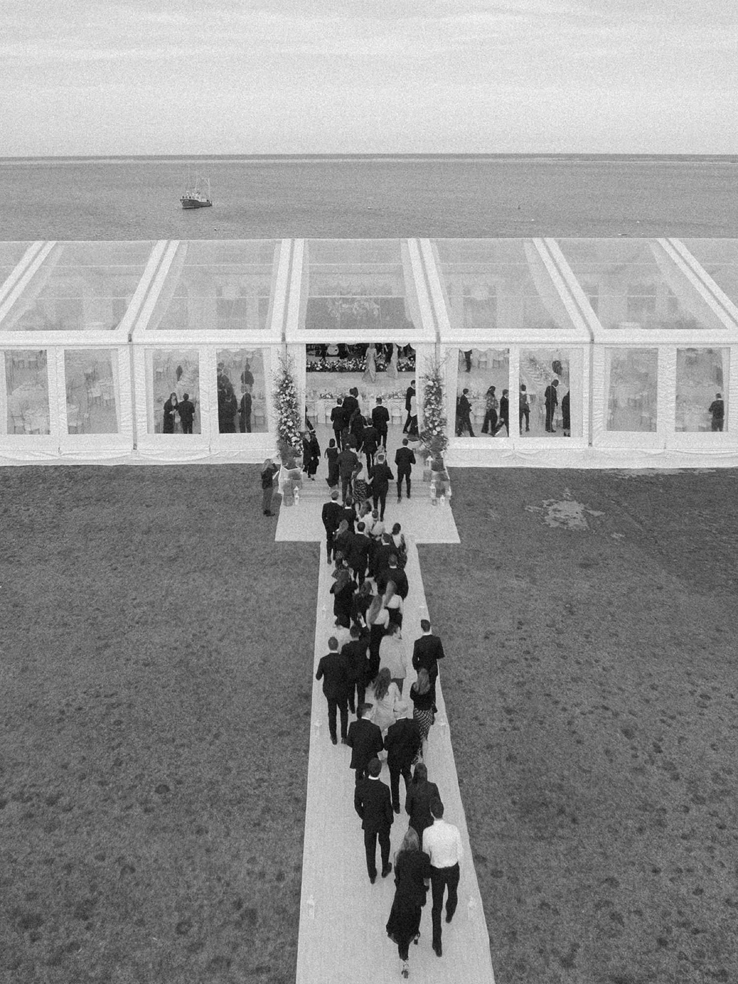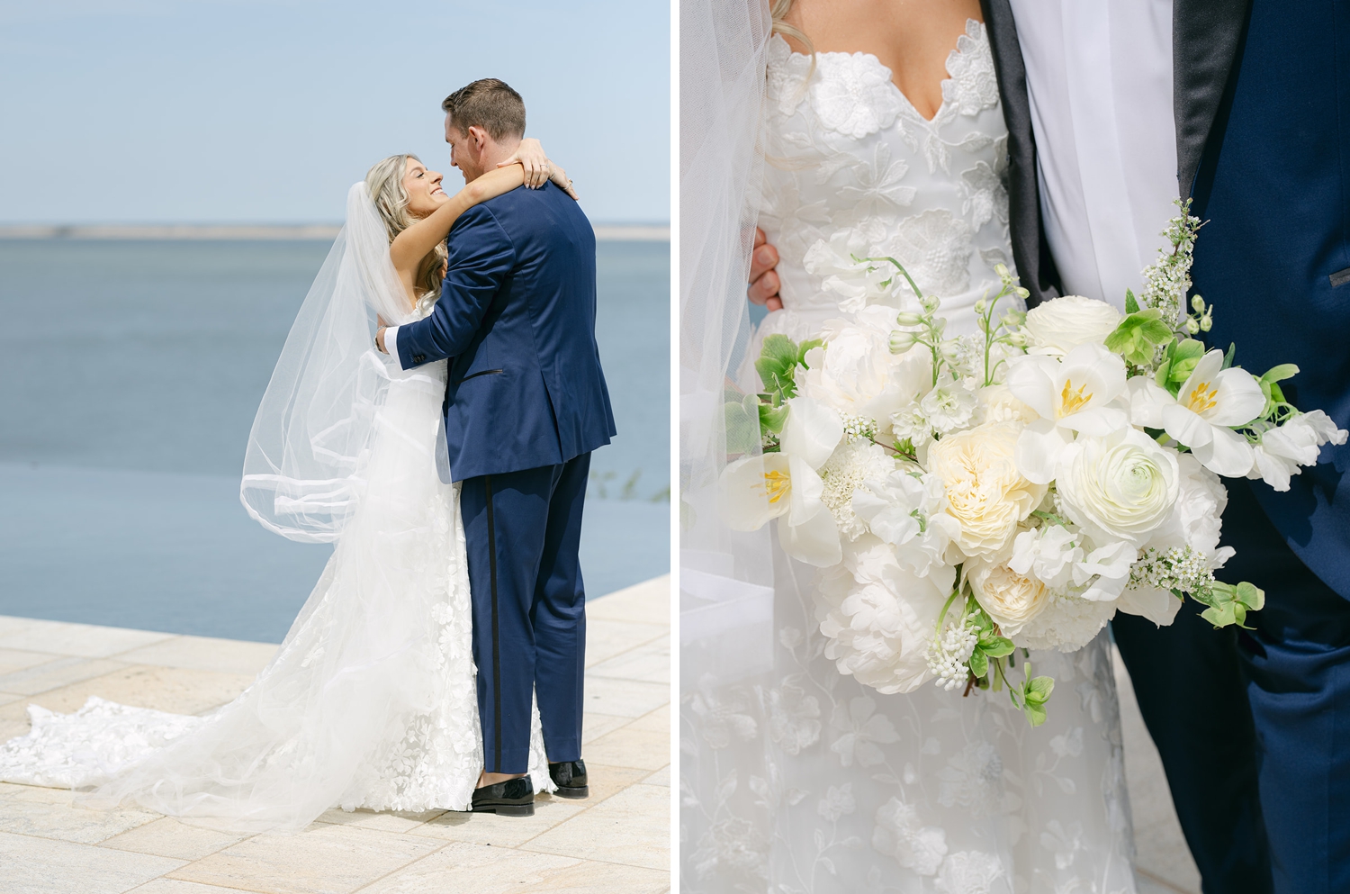 Following a heartfelt church ceremony downtown, guests gathered beneath a clear-top tent overlooking the ocean. Every detail, from the sculptural florals by Beach Plum Floral to the monogrammed bar and sweeping sailcloth accents, was thoughtfully designed to complement the coastal surroundings while maintaining a sense of elevated sophistication.