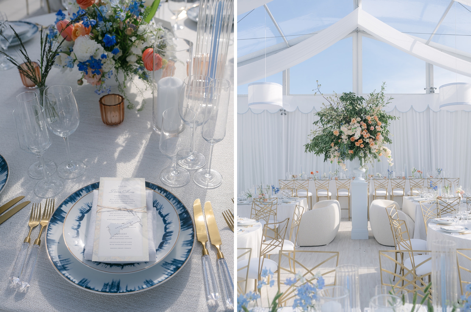 An airy, modern celebration by the sea, Maddy and Ben’s wedding captured the timeless elegance of New England with a fresh, coastal twist. Set at the picturesque Chatham Bars Inn, their day blended crisp blue-and-white tones with soft gold, peach, and cream — the perfect palette for a Cape Cod spring.