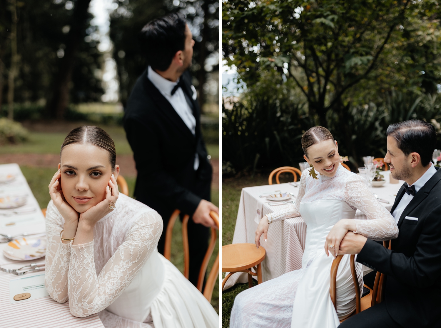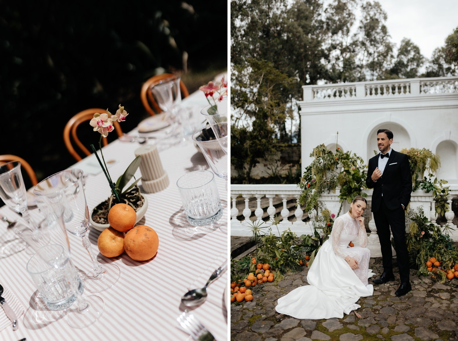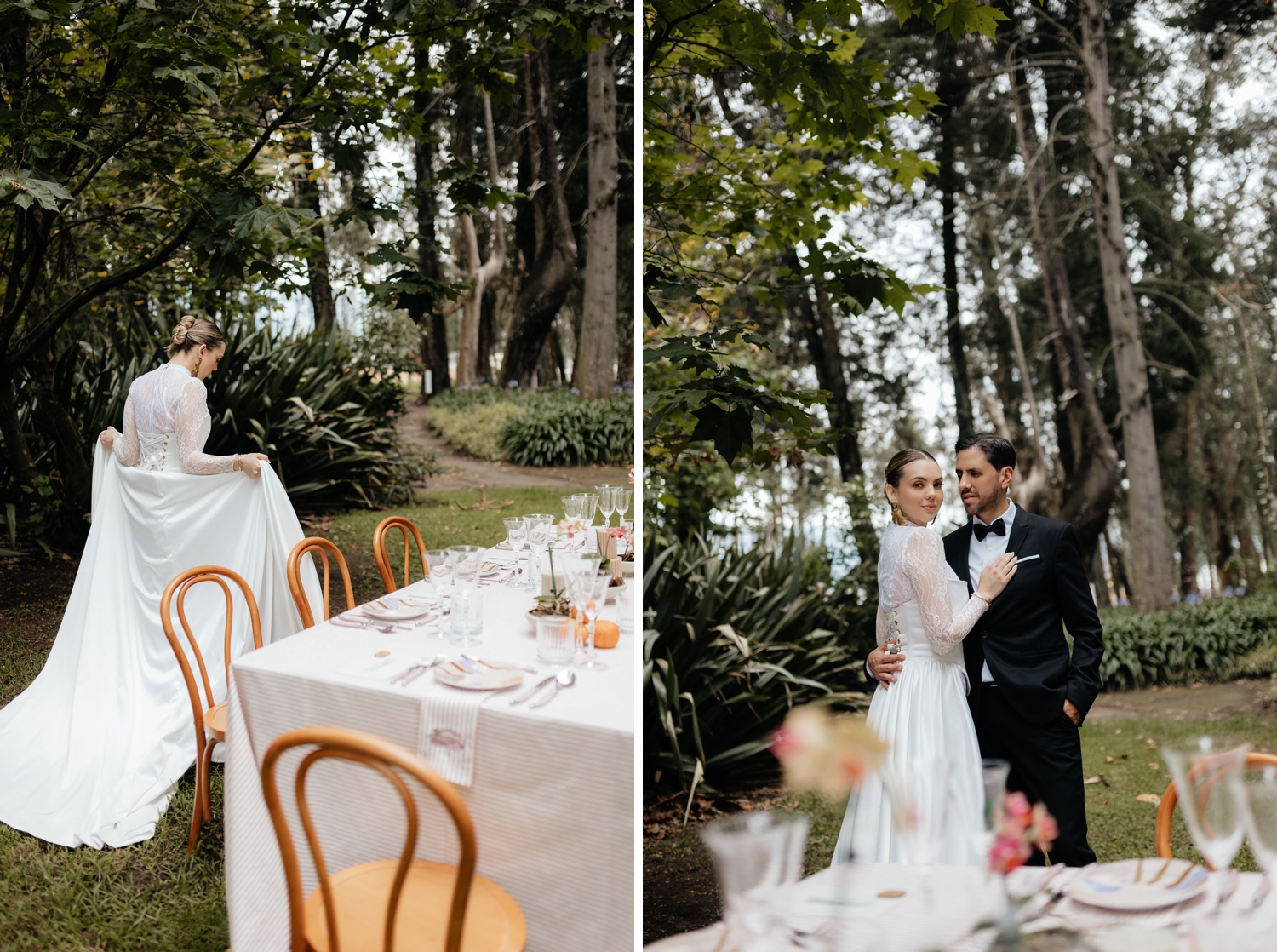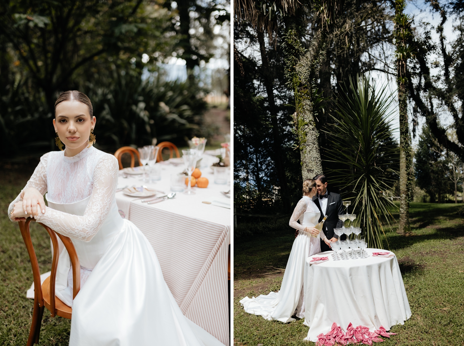 Luciana’s gown echoed the same balance — a princess-like silhouette grounded by a striking corset that added a modern edge. Ancestral Ecuadorian jewelry by designer Luz Marina completed the look, honoring heritage while reinforcing the shoot’s deeply intentional design story. Set beneath open skies and surrounded by lush gardens, the vow renewal was both intimate and expansive, reflective of Ecuador’s growing presence as a destination for uniquely styled, art-driven celebrations.