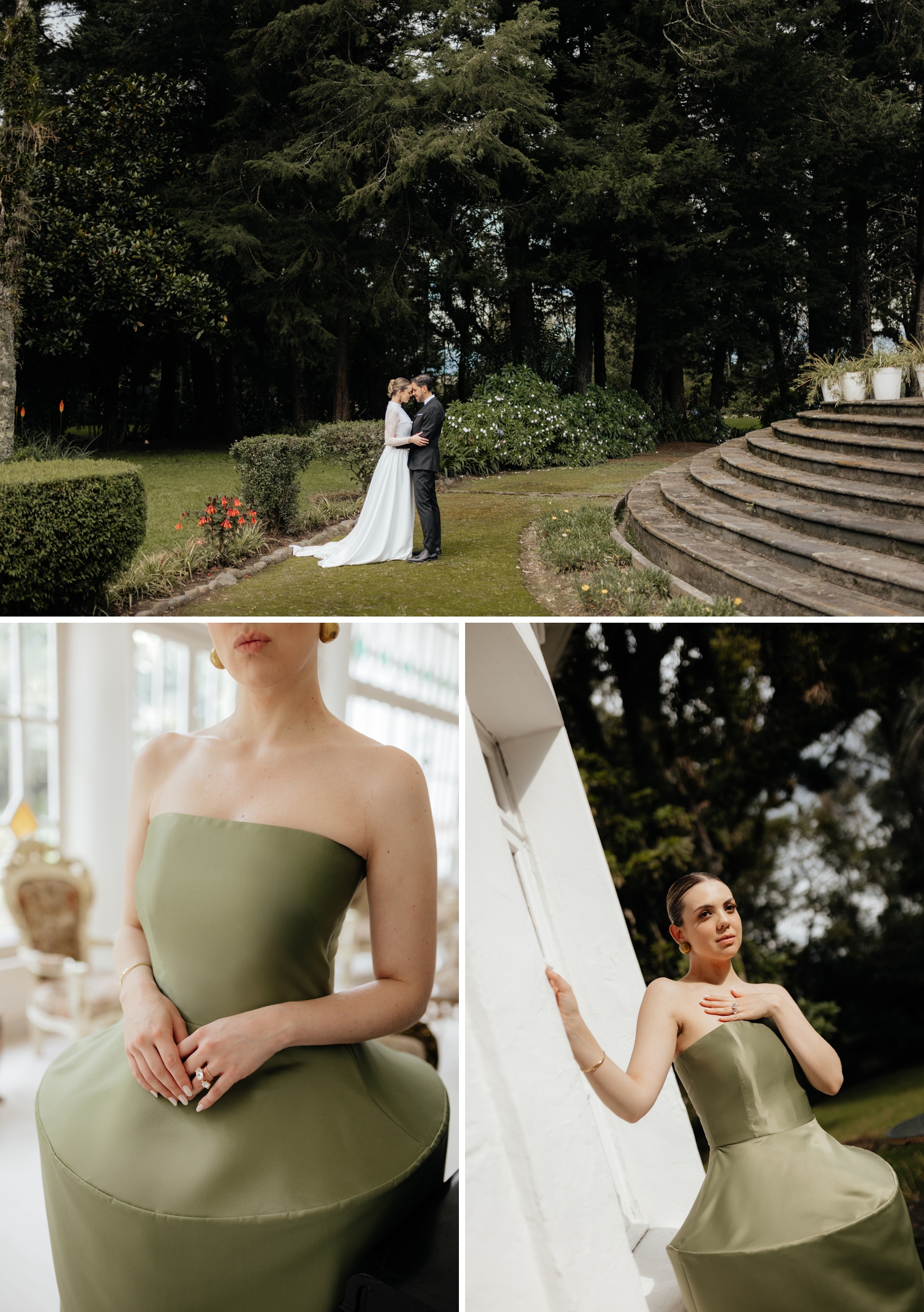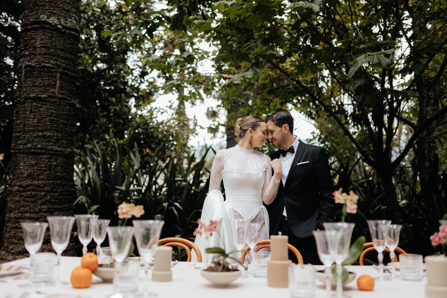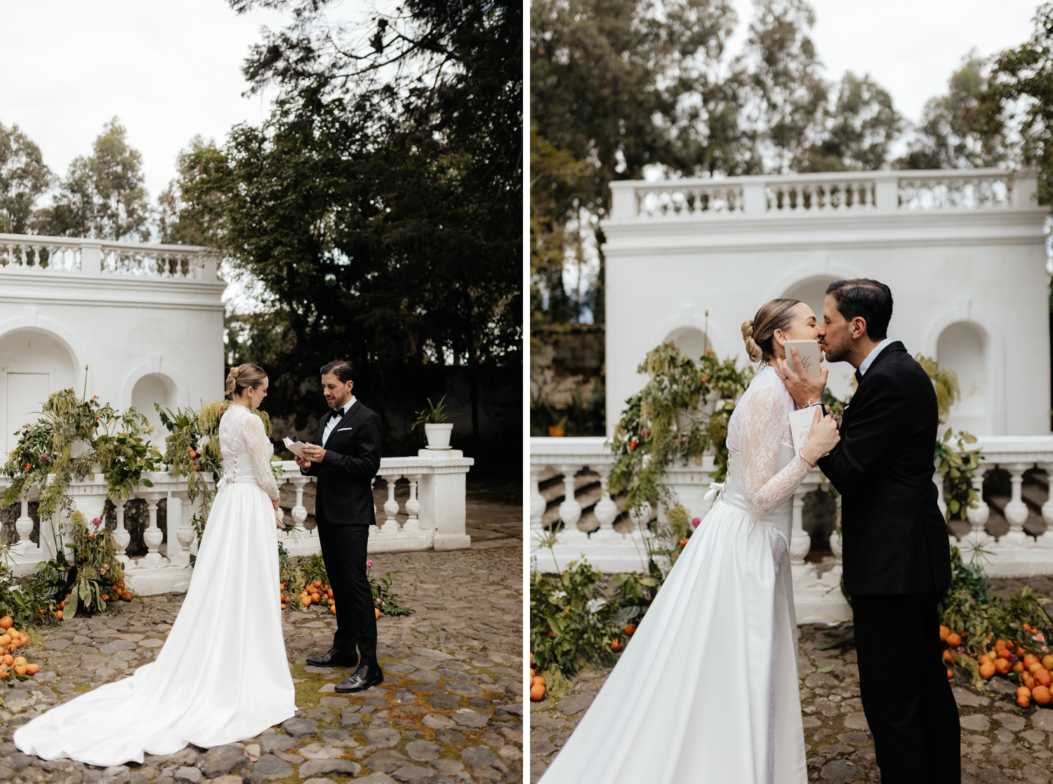 Luciana’s gown echoed the same balance — a princess-like silhouette grounded by a striking corset that added a modern edge. Ancestral Ecuadorian jewelry by designer Luz Marina completed the look, honoring heritage while reinforcing the shoot’s deeply intentional design story. Set beneath open skies and surrounded by lush gardens, the vow renewal was both intimate and expansive, reflective of Ecuador’s growing presence as a destination for uniquely styled, art-driven celebrations.