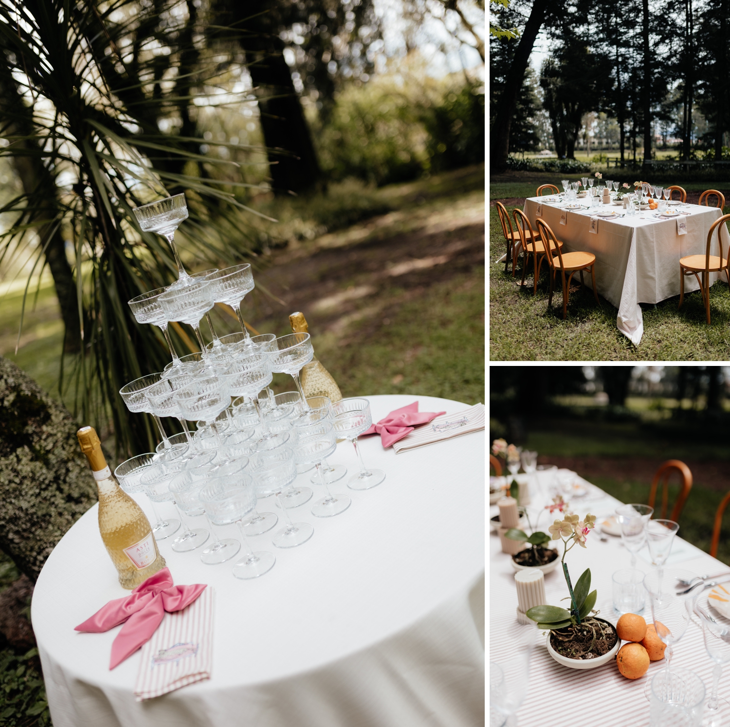 Intentional contrasts defined the design throughout the celebration. Contemporary elements were layered against antique wall paintings to bridge eras, while minimalist orchids were paired with whimsical, modern napkins for a playful tablescape moment. Local artist dishware, pink cutlery, and vintage crystal glassware brought texture and personality to the setting, celebrating eclecticism in its most thoughtful form.