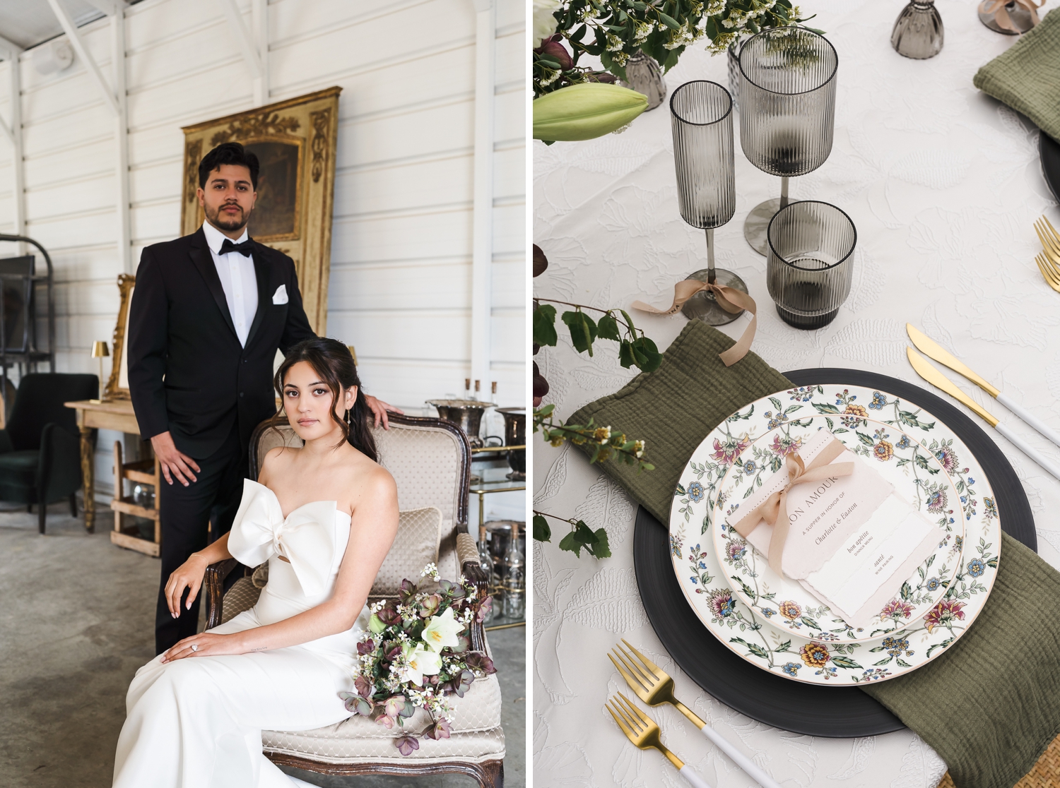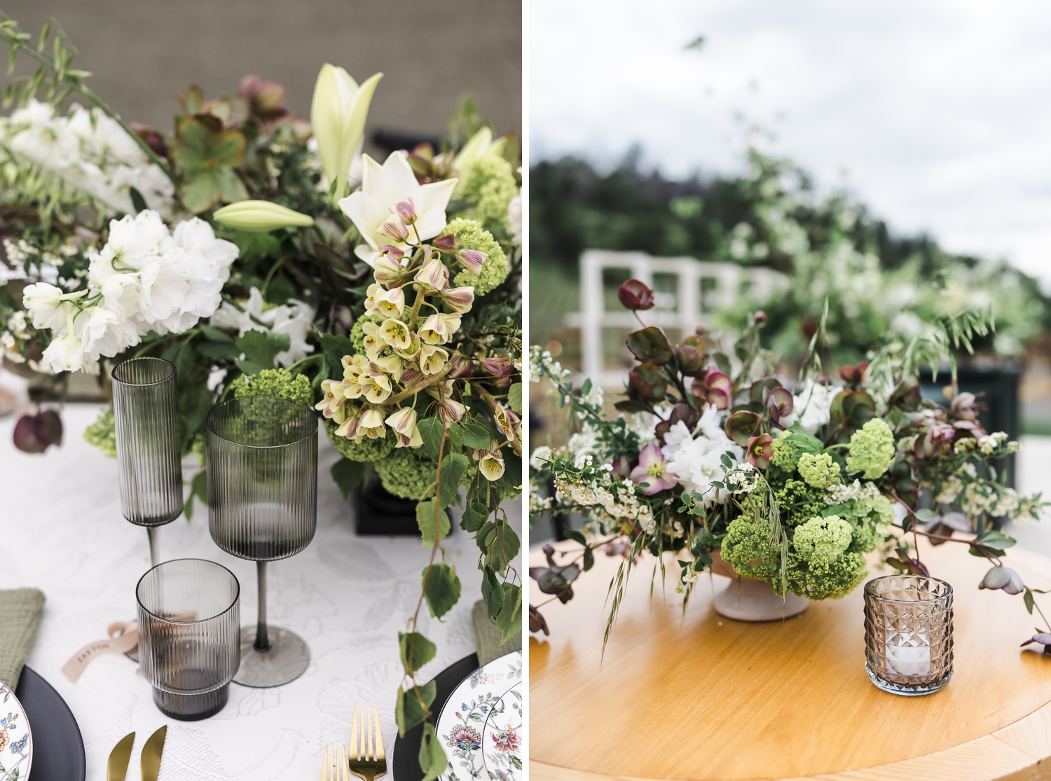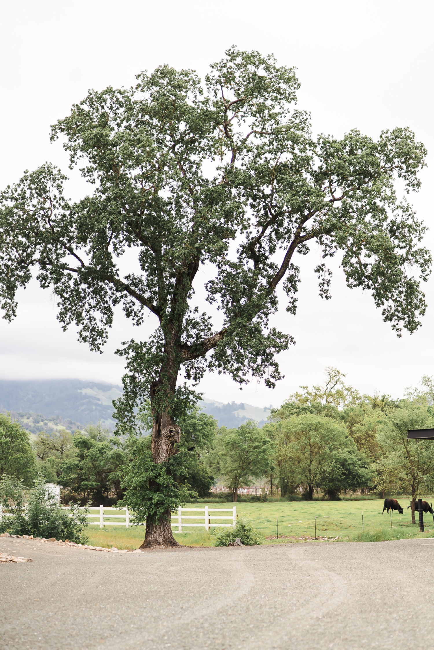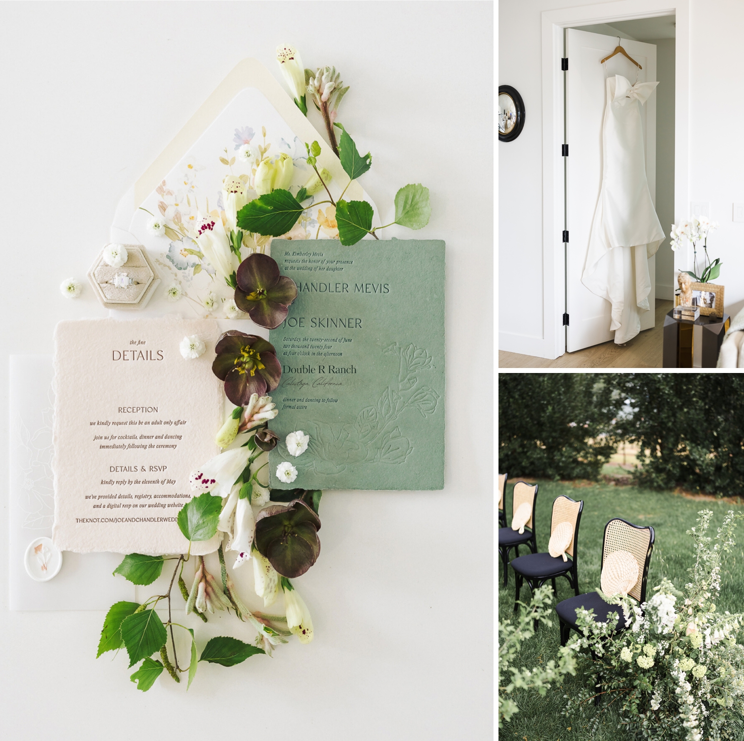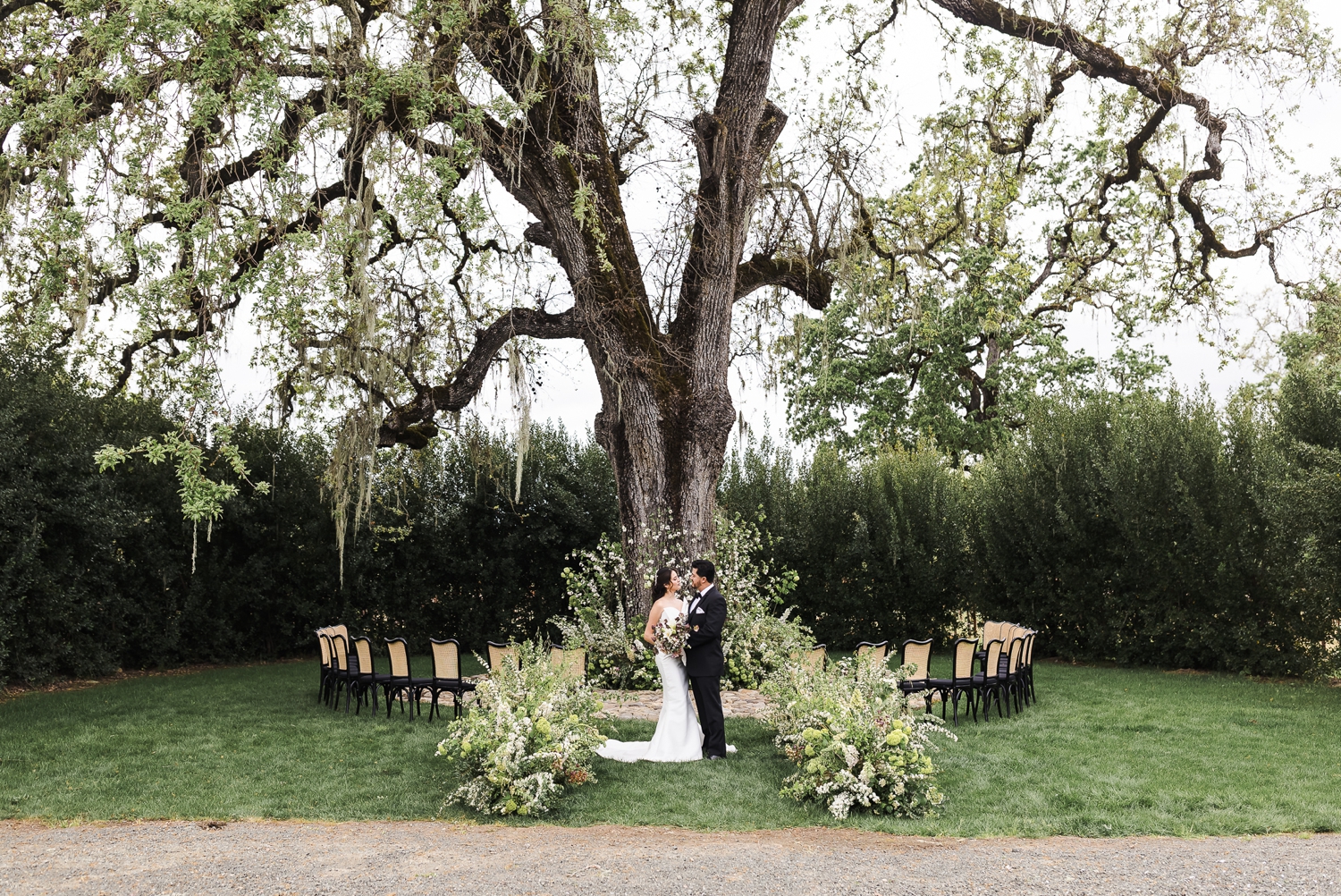 Designed by L’Relyea Events and photographed by Kreate Photography, the creative team set out to inspire couples seeking an intimate, off-the-beaten-path Wine Country experience. Beneath a centuries-old oak tree, a ceremony vignette took shape—soft, organic, reverent—contrasted with chic bows, sculptural florals, and a modern palette that feels both current and timeless. The ranch’s expansive surroundings offered a sense of quiet luxury, the kind only found on private estates hidden deep within Wine Country.