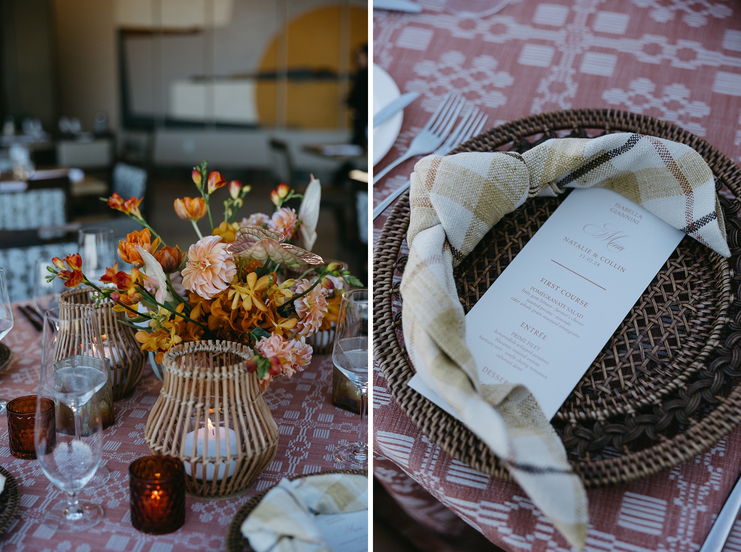 The evening before Natalie and Collin’s wedding unfolded as a quiet, intentional prelude to the celebration ahead. Set beneath the desert sky at The Reserve Club, guests gathered for an intimate welcome dinner that felt relaxed yet beautifully refined — a moment to slow down, connect, and savor the anticipation of what was to come.