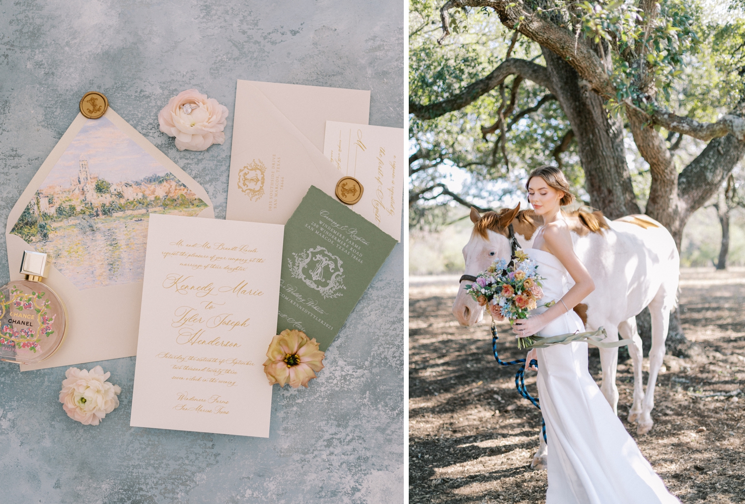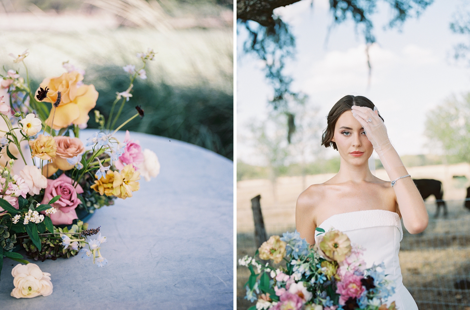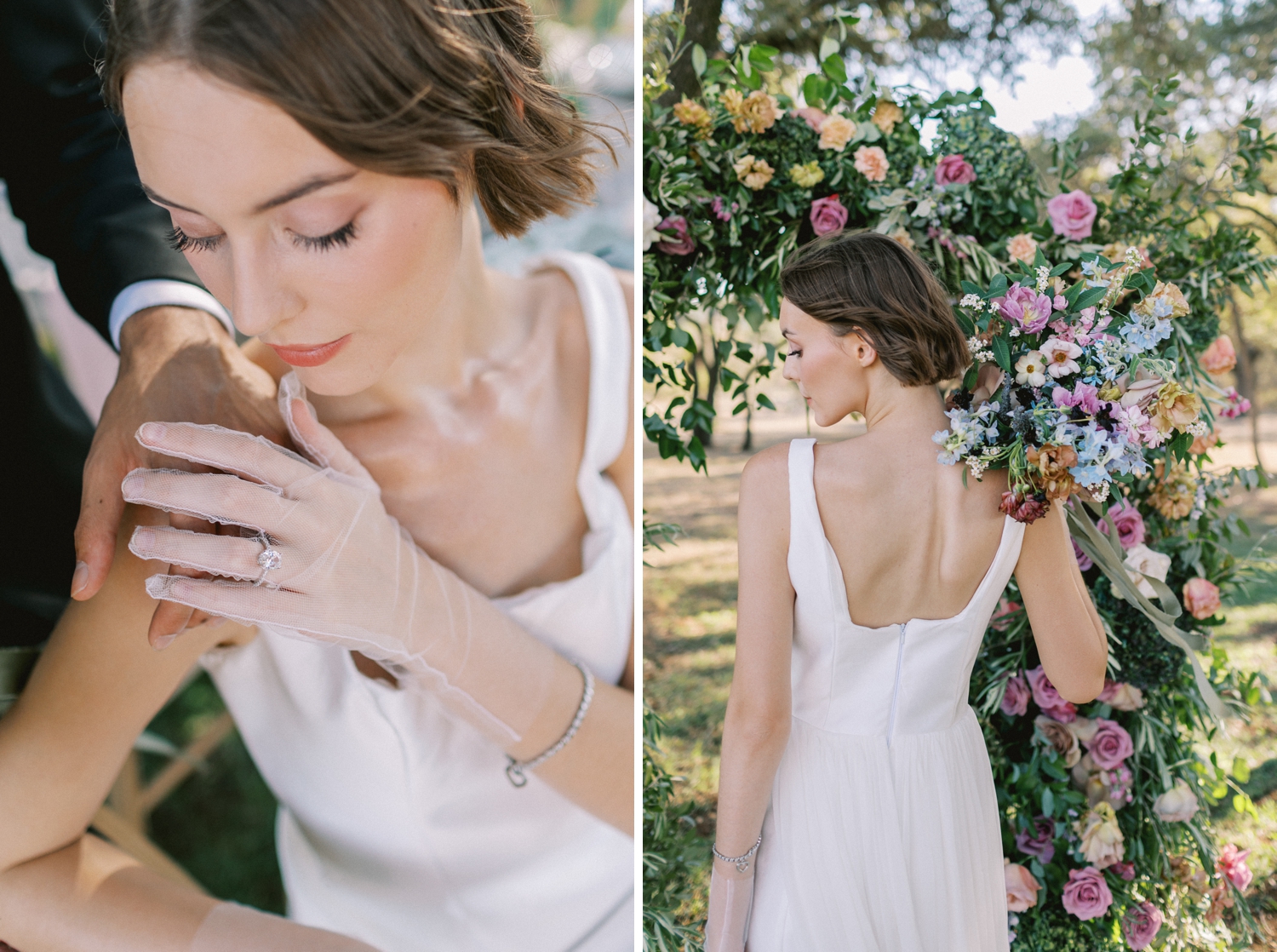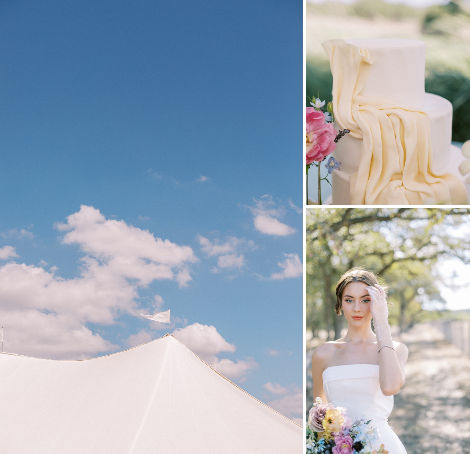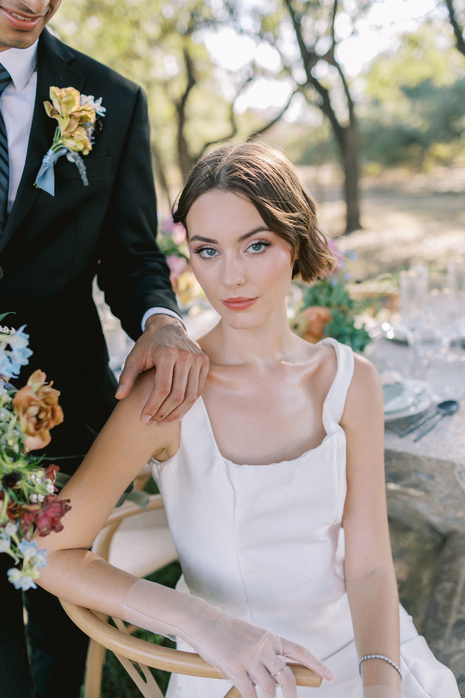 Styled by Morgan Marie Events, the setting evokes a timeless countryside sophistication: delicate lace gloves, a sculptural Christian Joy gown, and poetic florals by The Flowered Blue that seem to breathe life into the scene. The cake by Whisk and Twirl, intricate in its simplicity, pairs perfectly with bespoke paper details by Shop Aurea — a reminder that artistry often lives in restraint.