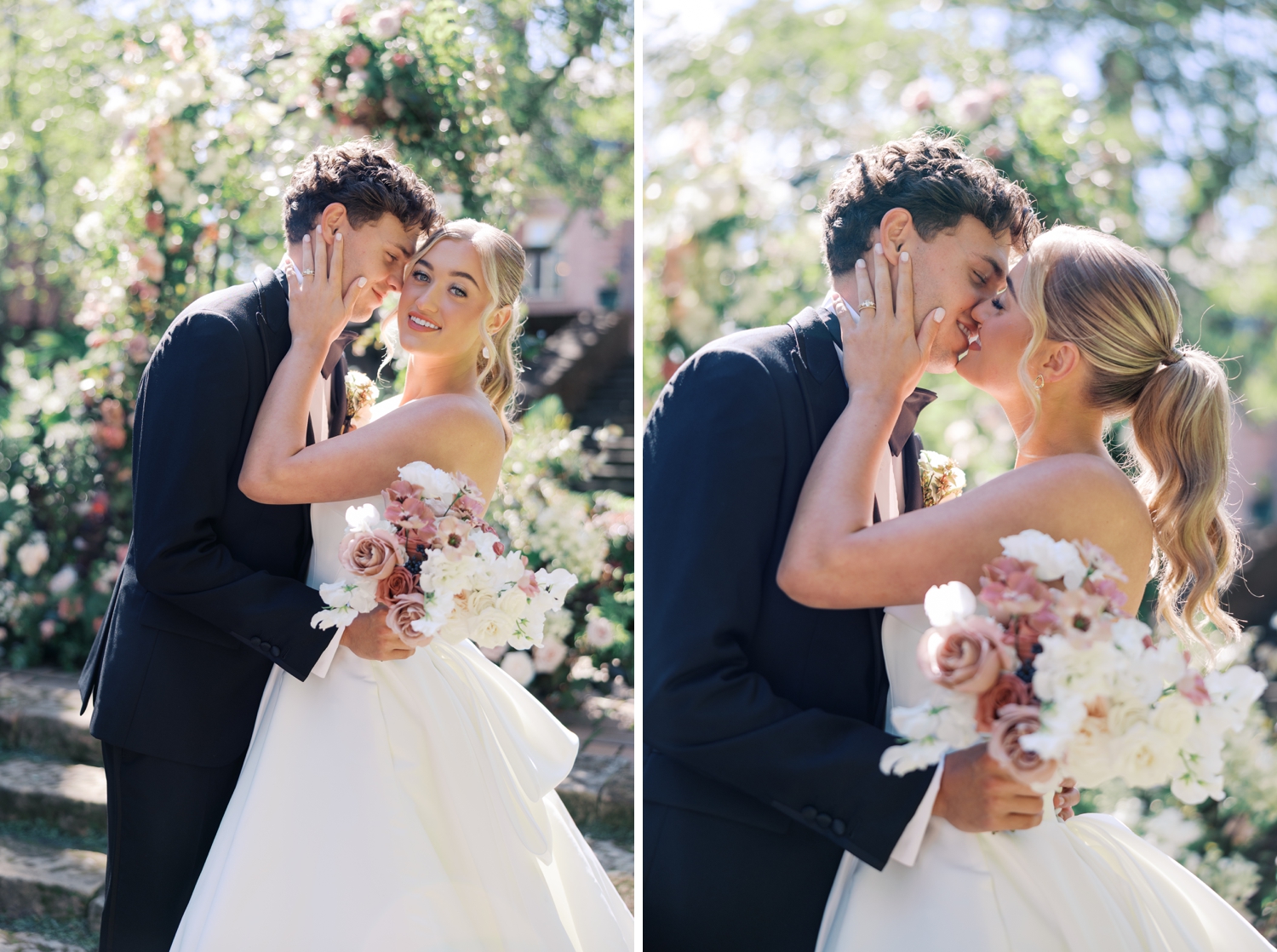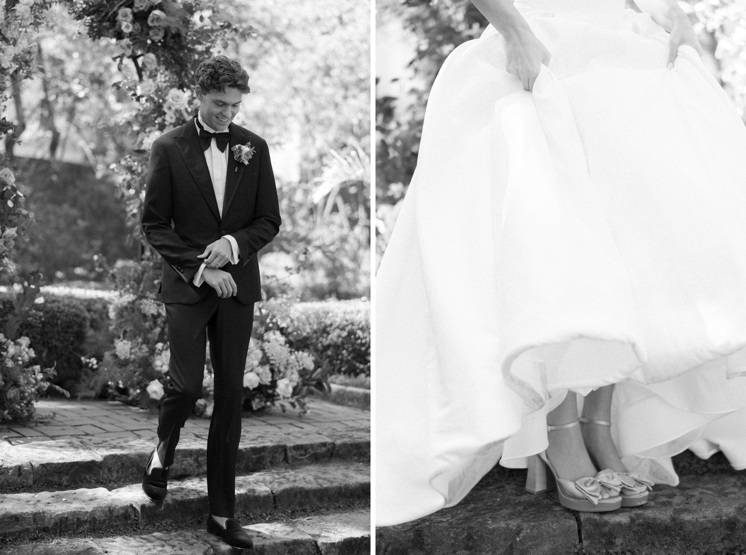 Featuring two couples and one solo bride, the imagery explores contrast and cohesion in equal measure. One couple embodied classic elegance—anchored by a clean, structured gown and a timeless black tuxedo—while the second brought a sense of playful romance, wearing a voluminous ruffled gown that moved effortlessly through the gardens. The solo bride offered a quieter, fashion-forward perspective, captured in refined portraits that emphasized artistry, light, and composition.