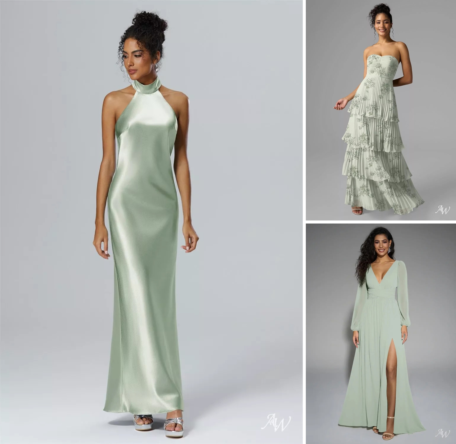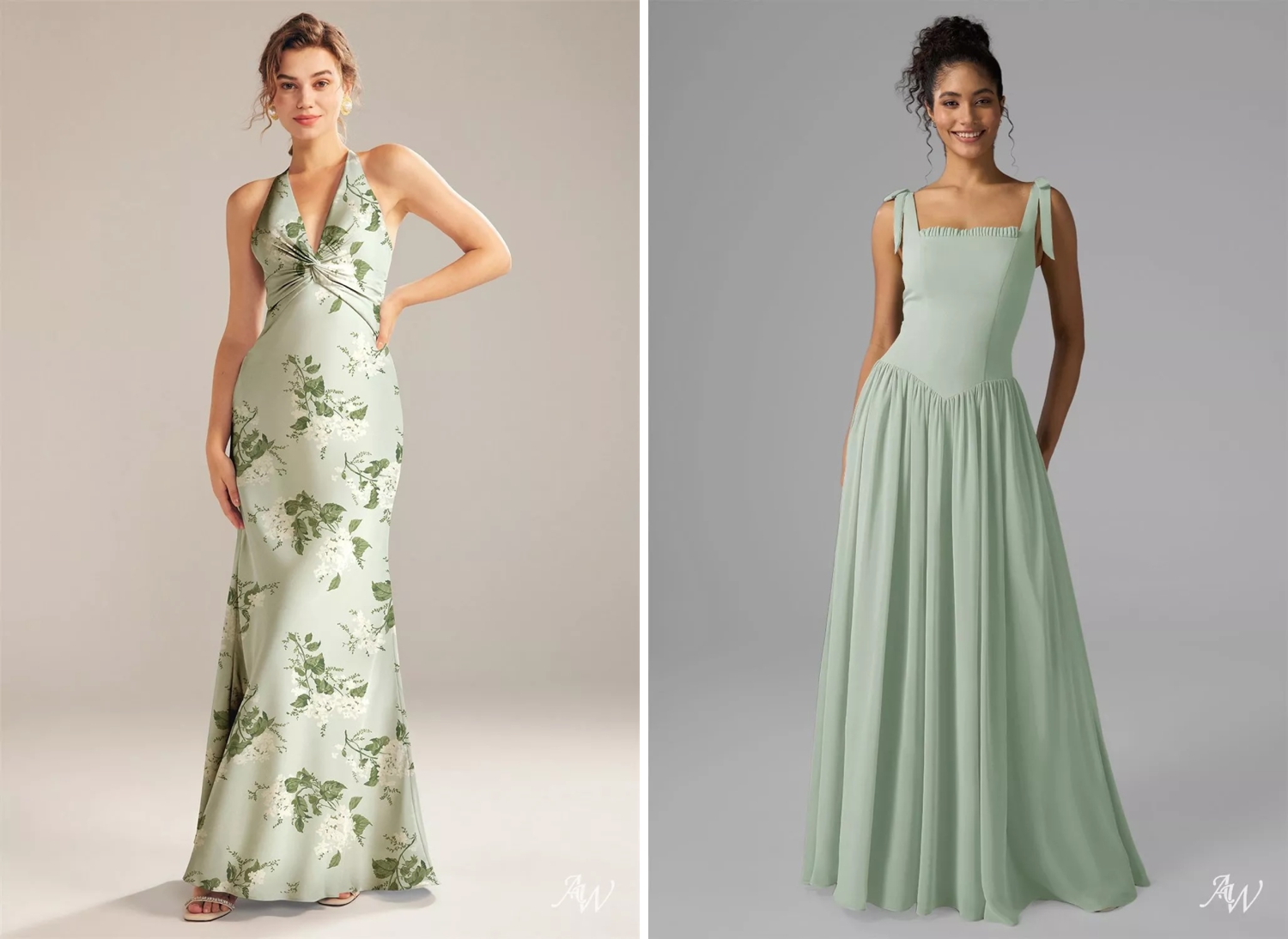AW Bridal nails this concept beautifully. Their sage green dresses range from floaty and romantic to sleek and modern — which means your bridal party can choose a style that feels personal to them without clashing with the overall vibe. The result? A bridal party that looks coordinated but not cookie-cutter.