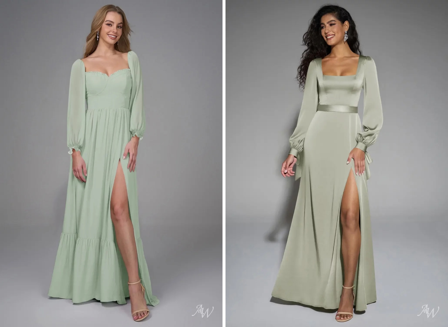AW Bridal’s sage green bridesmaid dress collection is full of silhouettes your friends will actually want to wear. Think flowy gowns for the romantic at heart, sleek lines for the minimalist bridesmaid, and whimsical garden-party styles for the free-spirited friend. Each one is thoughtfully designed to flatter different body types while still tying the bridal party look together seamlessly.