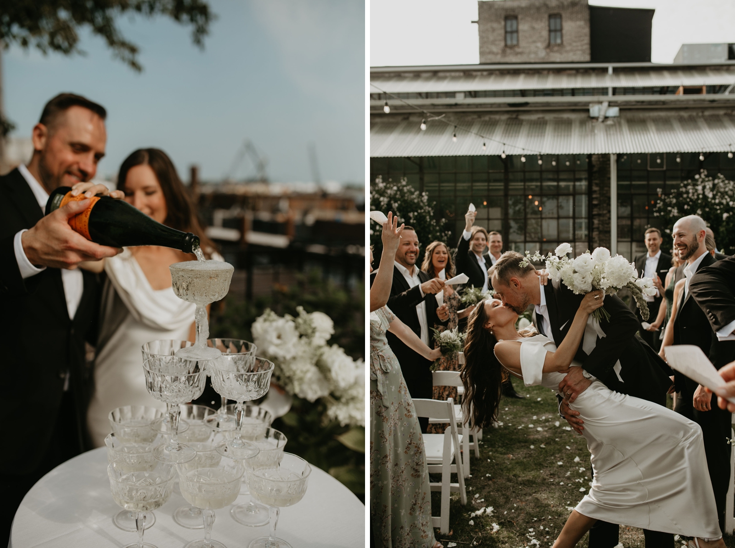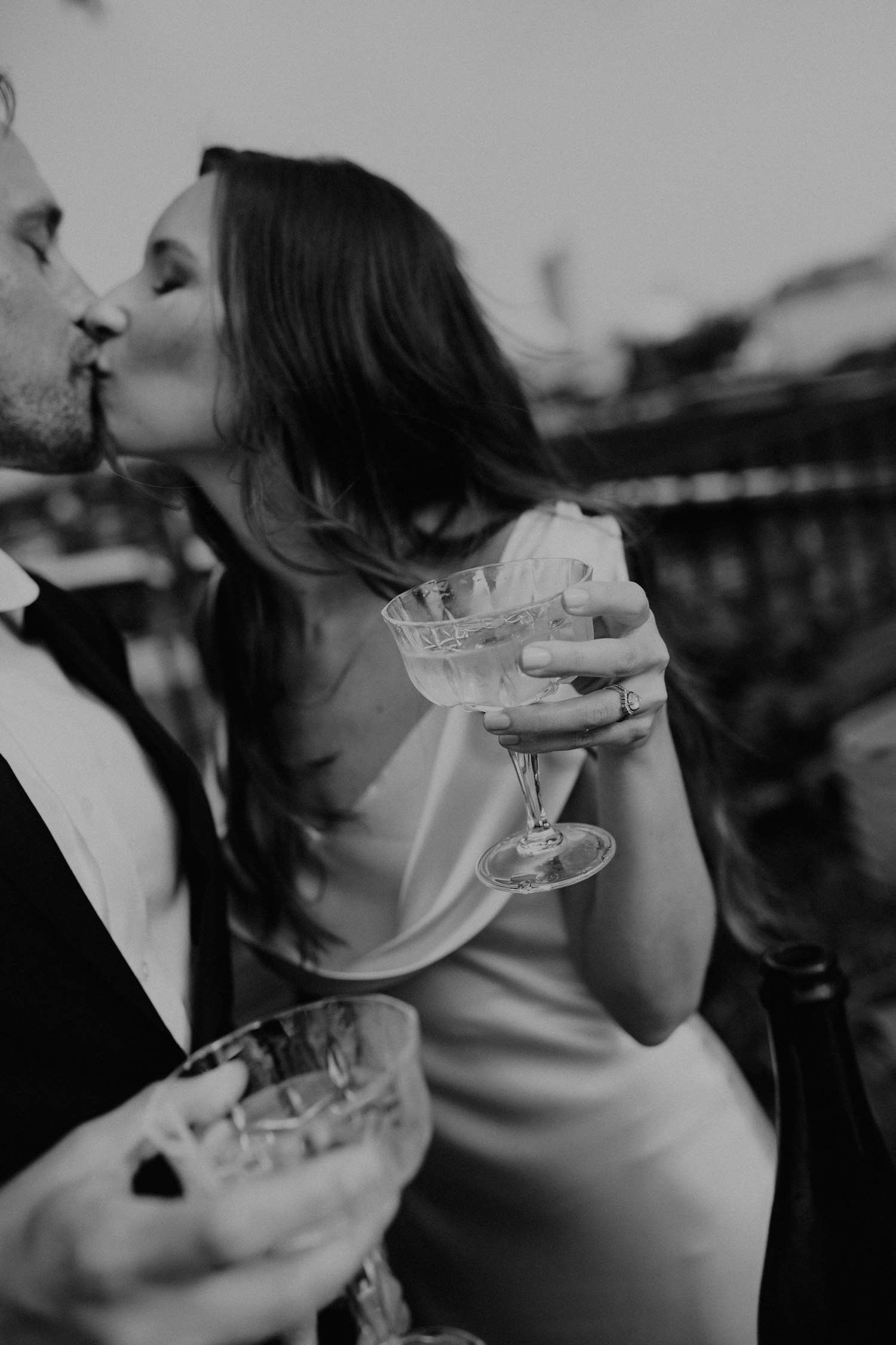 The celebration itself felt thoughtfully unpolished in the best way. Champagne was poured from a vintage glassware tower. Tables were set with mismatched floral china, giving the space an heirloom warmth. Guests danced beneath the open sky, while Storm and Taylor slipped away during blue hour for quiet rooftop moments overlooking the city — a reminder that sometimes the most meaningful memories happen just outside the timeline.